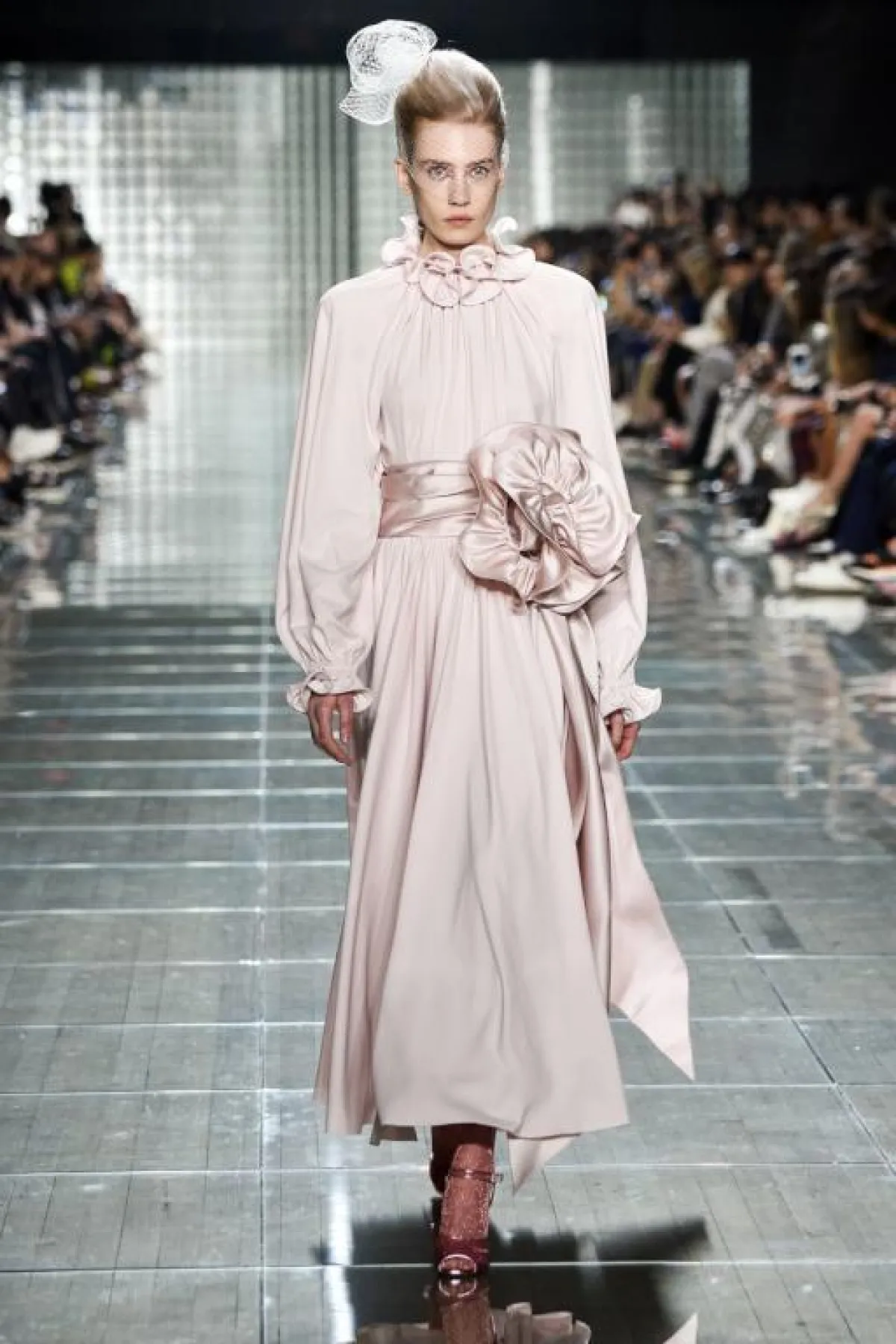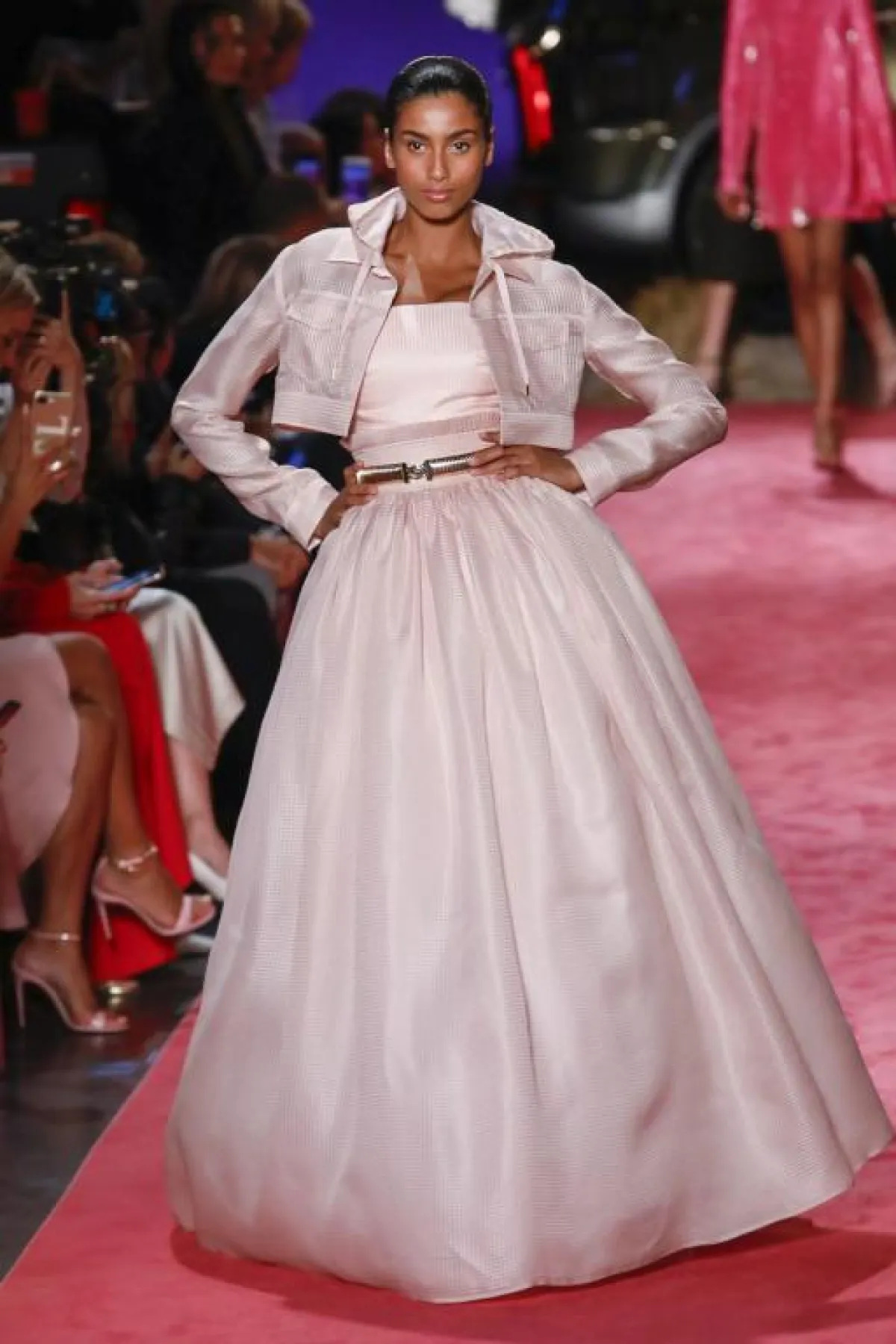 كما قدمت دار Brandon Maxwell فستاناً وردياً فاتحاً تميز بقصّته المنفوشة Ball Gown مع سترة قصيرة وحزام حول الخصر.