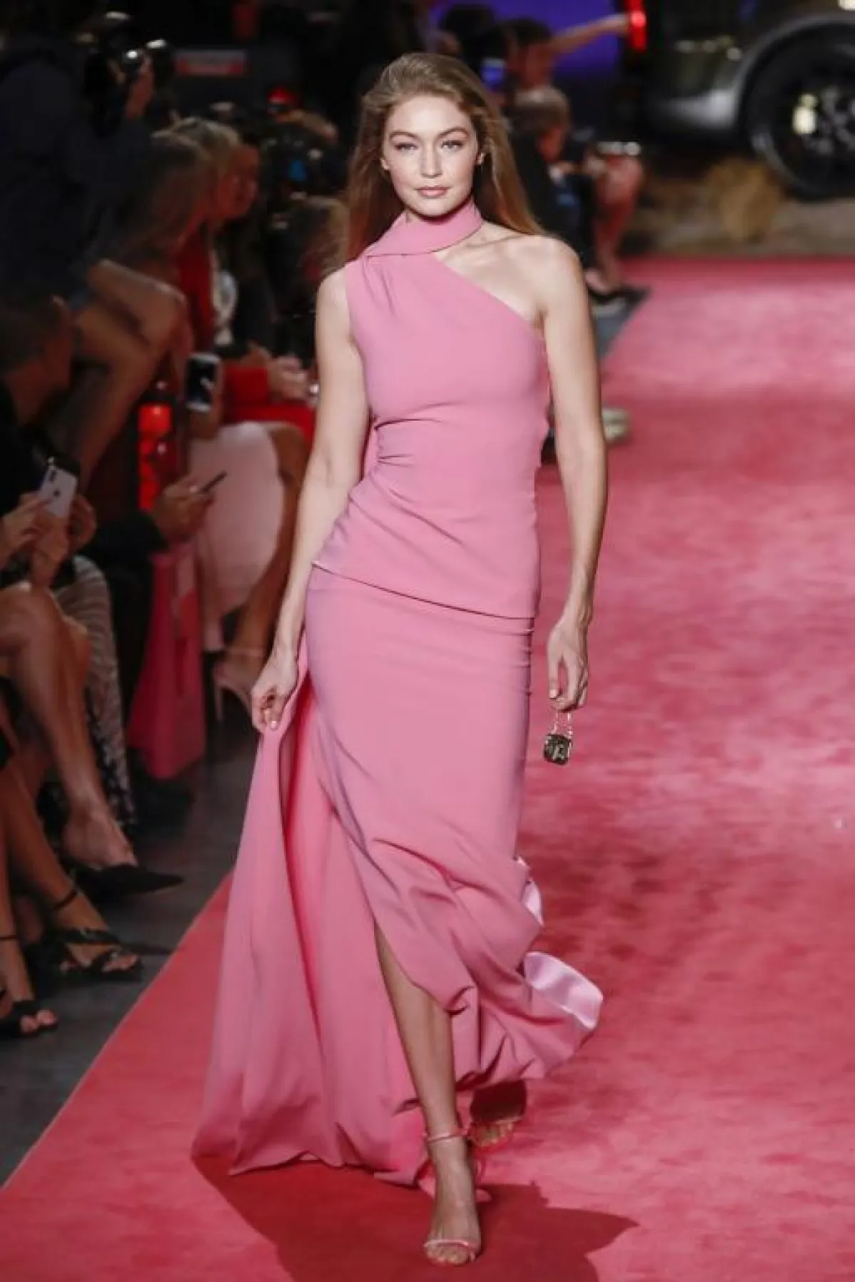 وبدرجة متوسطة، تألقت العارضة جيجي حديد Gigi Hadid بفستان وردي تميز بتصميمه العصري بالكتف الواحد مع وشاح الرقبة وشق جانبي طويل، وهو أيضاً من توقيع Brandon Maxwell.