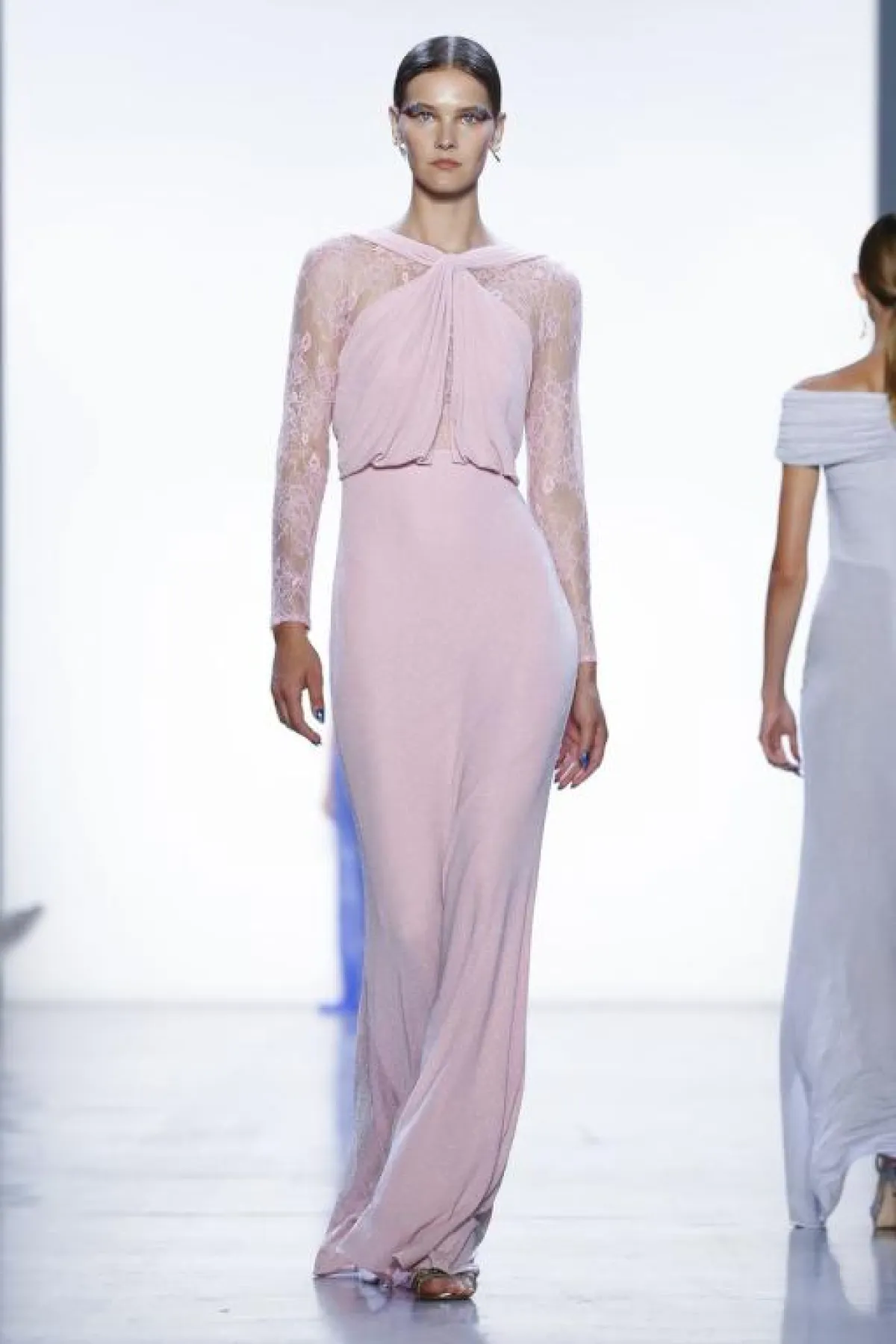 كذلك قدمت دار بادجلي ميشكا Badgley Mischka فستاناً وردياً أنثوياً مزيناً بتطريزات الورود على القماش الشفاف مع أكمام طويلة شفافة وقبّة V، وهذا التصميم يساعد في إخفاء عيوب الجسم للعروس.