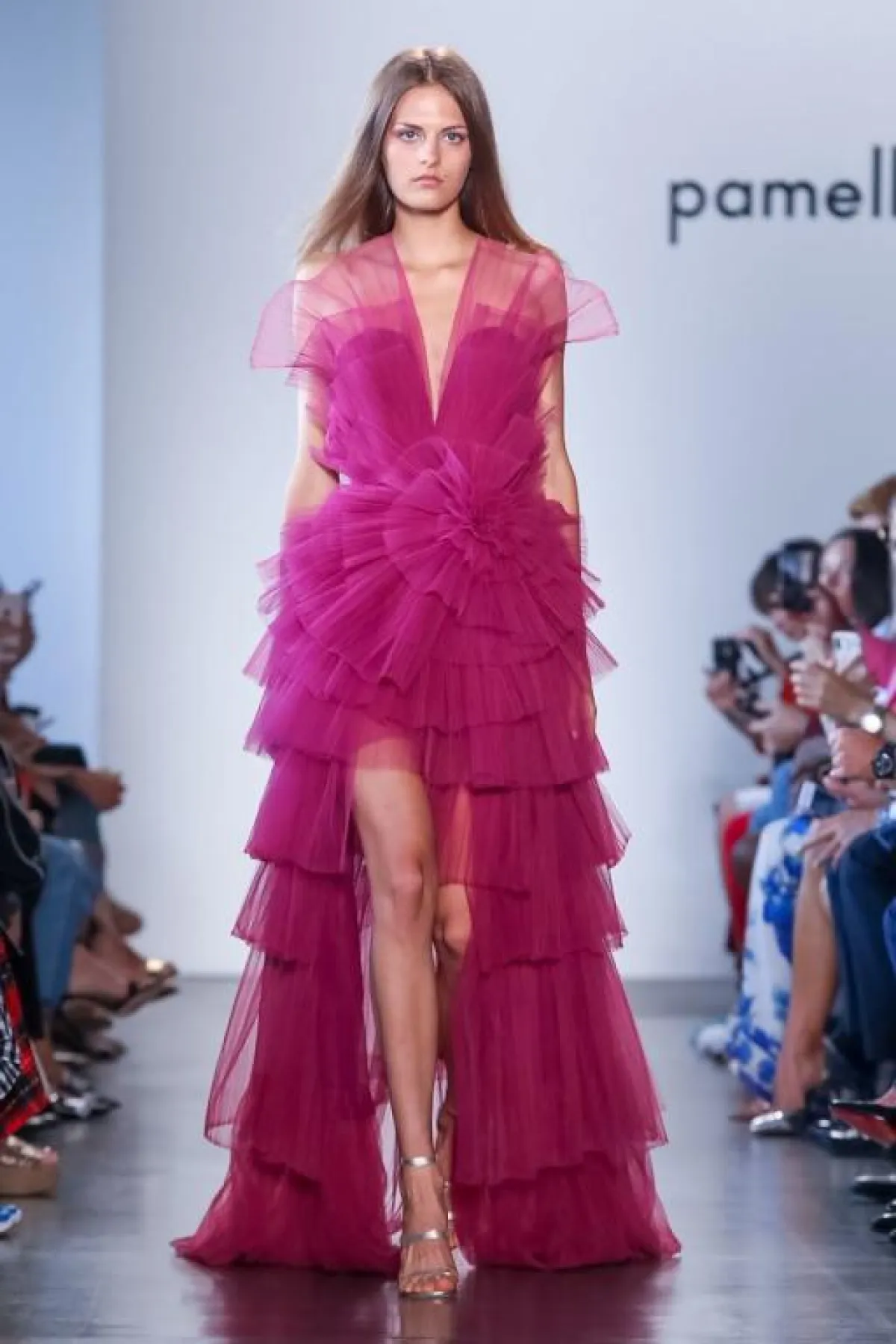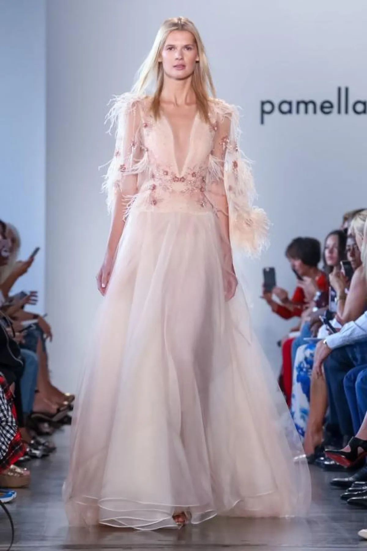 أما دار باميلا رولان Pamella Roland فأبدعت في الفساتين الوردية بالدرجة الزاهية، وقدمت الفستان بتصميم الوردة من خلال طبقات التول متدرجة الأطوال، وفستانا آخر رومانسيا بقماش الشيفون مع الأكتاف المنسدلة Off Shoulder.