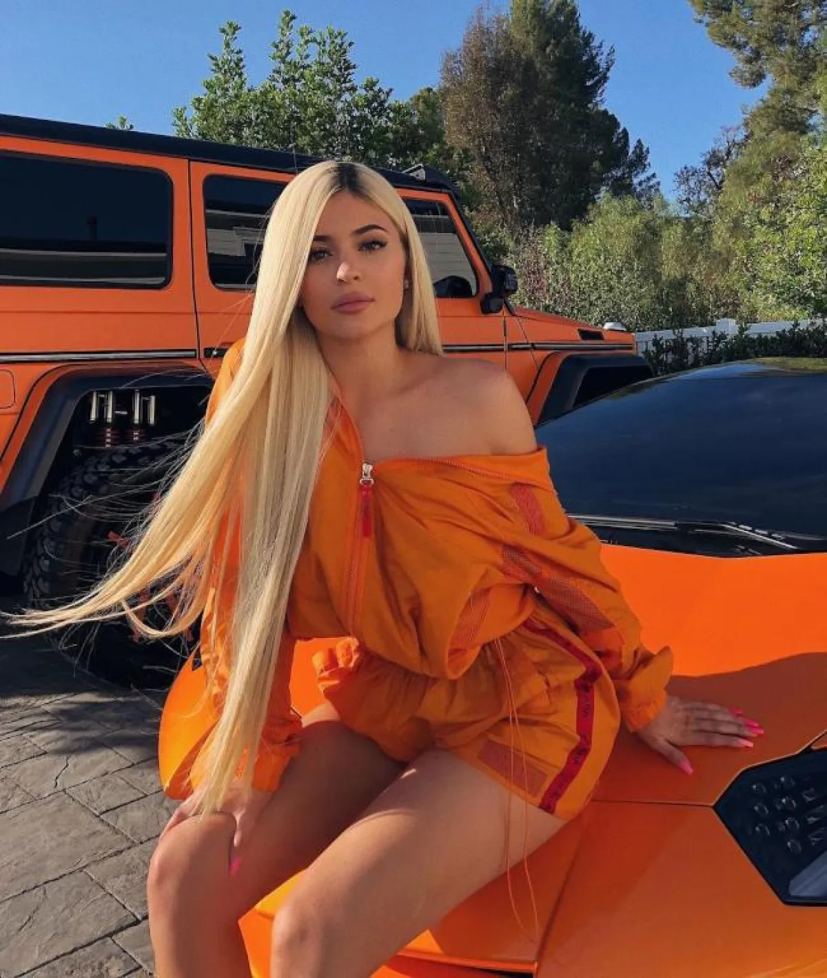 أيام قليلة ثم عاوت كايلي جينر الظهور باللون البرتقالي المضيء ولكن هذه المرة نسقت إطلالتها الرياضية مع لون سيارتها الجديدة، لتؤكد على على أن اللون البرتقالي هو لونها القادم بعد الأخضر المضيء والوردي القوي.