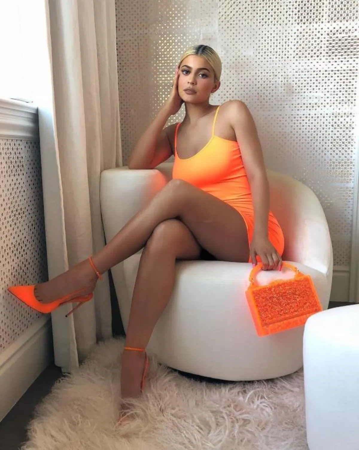 وكعادتها اختارت كايلي إطلالة جريئة بفستان نوم مزين باللون البرتقالي المضيء ونسقته مع حقيبة تكاد تشع ضوءاً من قوة اللون، وحذاء بنفس الطاقة، ربما لا تجروء الفتاة العادية على اعتماد إطلالة هكذا ليس لجرأتها فقط بينما لقوة اللون الخاطف.
