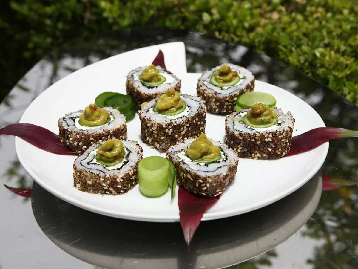 7-تلفّ أوراق الطحالب ببطء، حتّى تشكّل لفائف متماسكة. ثمّ تقطّع كلّ واحدة منها إلى 6 قطع، فتغمس في مزيج من الصعتر والسمّاق المحمّص والسمسم وحبّ البركة.