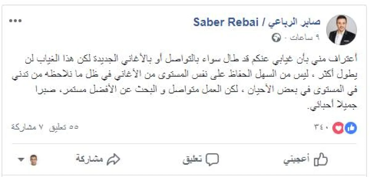 تقدّم المطرب التونسي صابر الرباعي باعتذار من جمهوره، عن غيابه الطويل مؤكداً أنه تأخر في التواصل معهم عبر مواقع التواصل الاجتماعي كما تأخر طويلاً في طرح أعمال فنية جديدة، مبرراً غيابه بتدنّي المستوى، ولكنه وعدهم بعودة قوية قريباً.