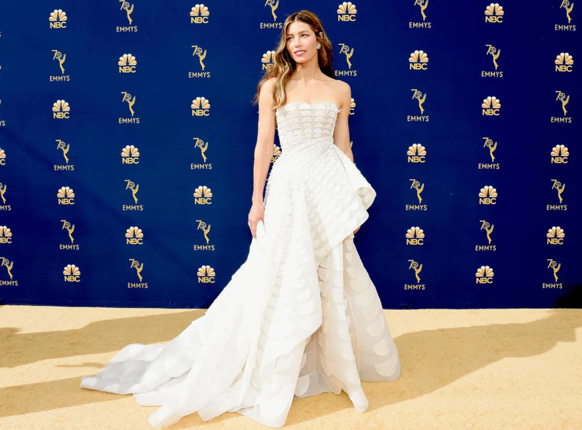 تألقت جيسيكا بيل Jessica Biel في فستان ذي تصميم فاخر من "رالف أند روسو" Ralph&Russo بتصميم مكشوف الأكتاف مصنوع من قصاصات من الأقمشة المحاكة مع بعضها البعض، وتنورته كبيرة مزينة بكشكش ناعم.