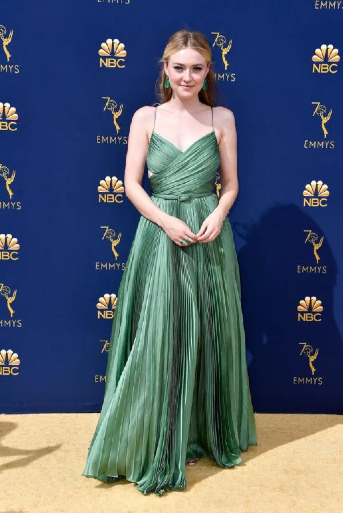 النجمة الشابة داكوتا فانينغ Dakota Fanning اختارت فستاناً ناعماً باللون الأخضر الهادئ من تصميم دار "ديور" Dior مزيناً بحزام على الخصر وقد اختارت معه أقراطاً باللون الأخضر أيضاً.