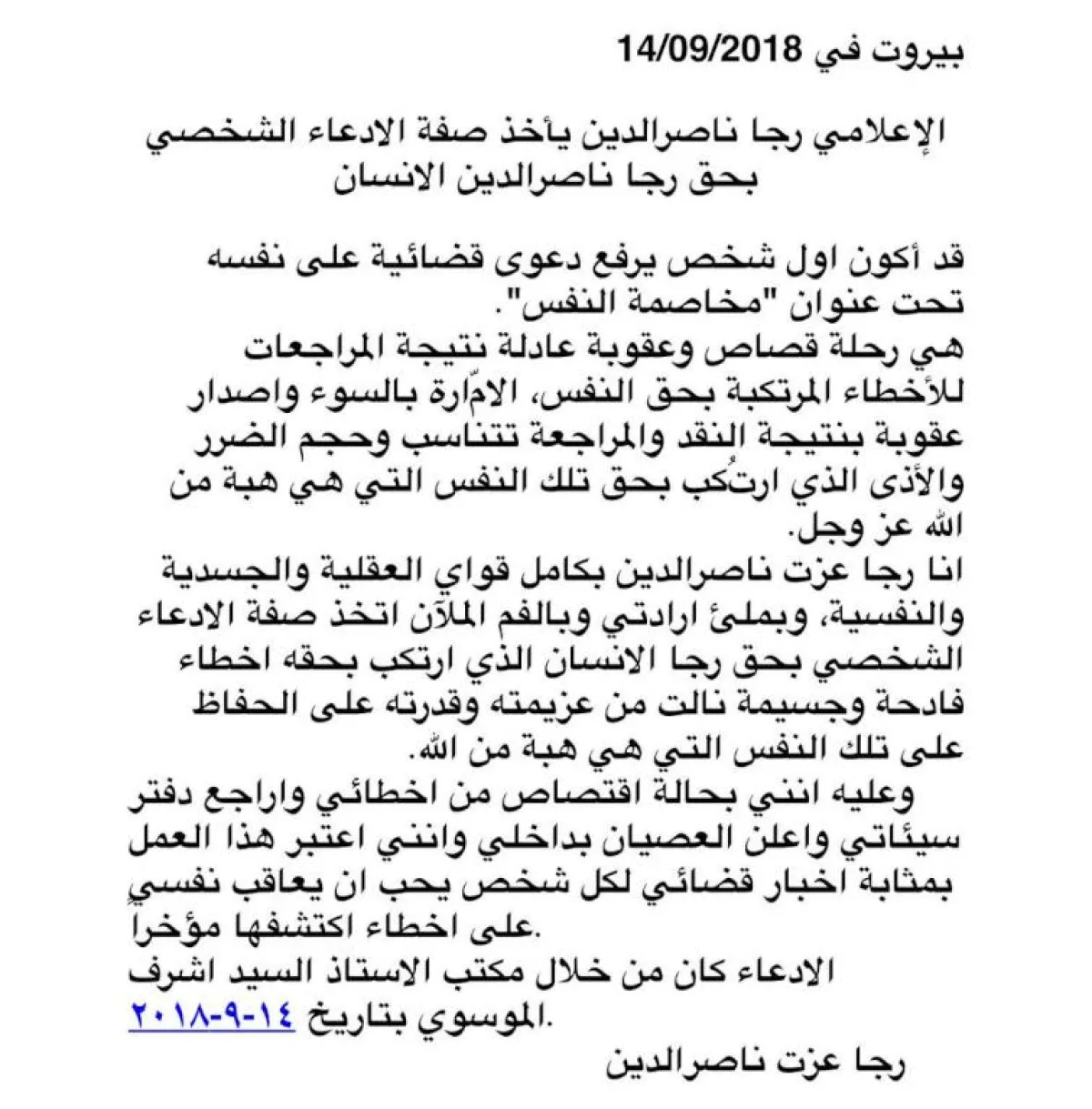 هي أغرب قضيّة في تاريخ القضاء اللبناني، رفعها الإعلامي رجا ناصر الدين ضد نفسه، وتوكّل فيها محامي المشاهير المعروف أشرف الموسوي، لتنتهي القضيّة من حيث بدأت.