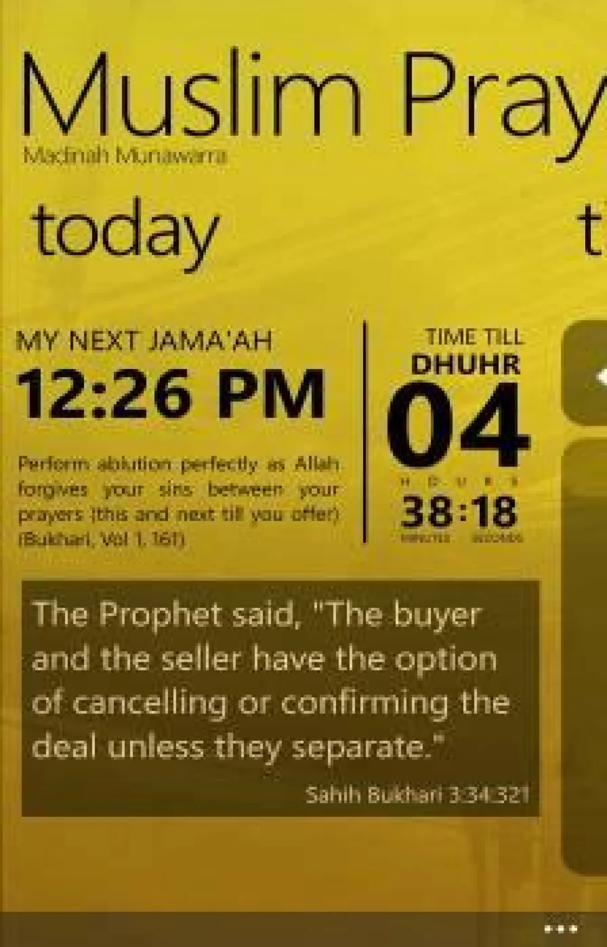 يتميّز تطبيق Muslim Prayers عن غيره بخياراته التي يمكن تعديلها إلى حدّ كبير. فكل المزايا، من أوقات الصلاة، إلى اتّجاه القبلة، وتحديد موقع المسجد، يمكن وضعها على القائمة الرئيسية والوصول إليها مباشرة من الشاشة الرئيسية. وقد دُمجت وظيفة تحديد موقع المسجد مباشرةً مع تطبيق نوكيا HERE Drive، ما يسمح للمستخدم بالاستفادة من الملاحة عبر التوجيه الصوتي بنقرة واحدة. بالإضافة إلى ذلك، يستفيد التطبيق بشكل جميل من مكعّبات Live Tiles الحيّة، ليرى المستخدم أوقات الصلاة على المكعّبات على الشاشة الرئيسية.