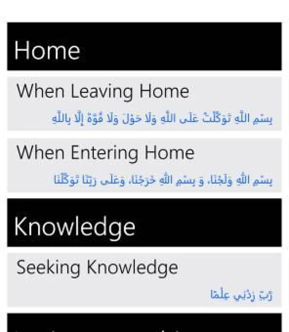 Essential Duas يضمّ مجموعة من الأدعية الإسلامية في واجهة بينية واضحة ومرتّبة تشبه تصاميم هاتف ويندوز، فيقدّم طريقة بسيطة وأنيقة في آن واحد لتلاوة الأدعية أثناء التنقّل. وتشمل الأدعية المهمّة نقل الحروف وترجمة كل دعاء لمساعدة المستخدم الذي لا يتكلّم العربية جيداً على فهم الدعاء وتعلّمه بشكل أفضل. وأخيراً، يسمح التطبيق بتشاطر الدعاء مع العائلة والأصدقاء عبر الرسائل القصيرة، والبريد الإلكتروني، والإعلام الاجتماعي.