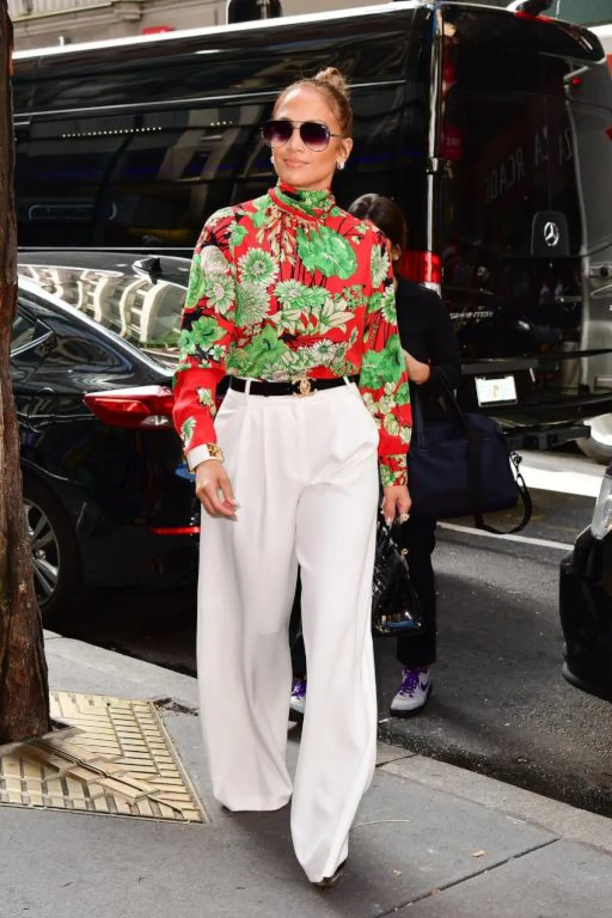 جنيفر لوبيز اختارت اللون الأبيض على بنطلون قماشي بقصة واسعة ومنسدلة، ونسقت معه قميصًا معرّقًا بألوان حيوية، وزينت اللوك بنظارات شمسية كبيرة وحزام على الخصر، وبدت غاية في الأناقة والعصرية.