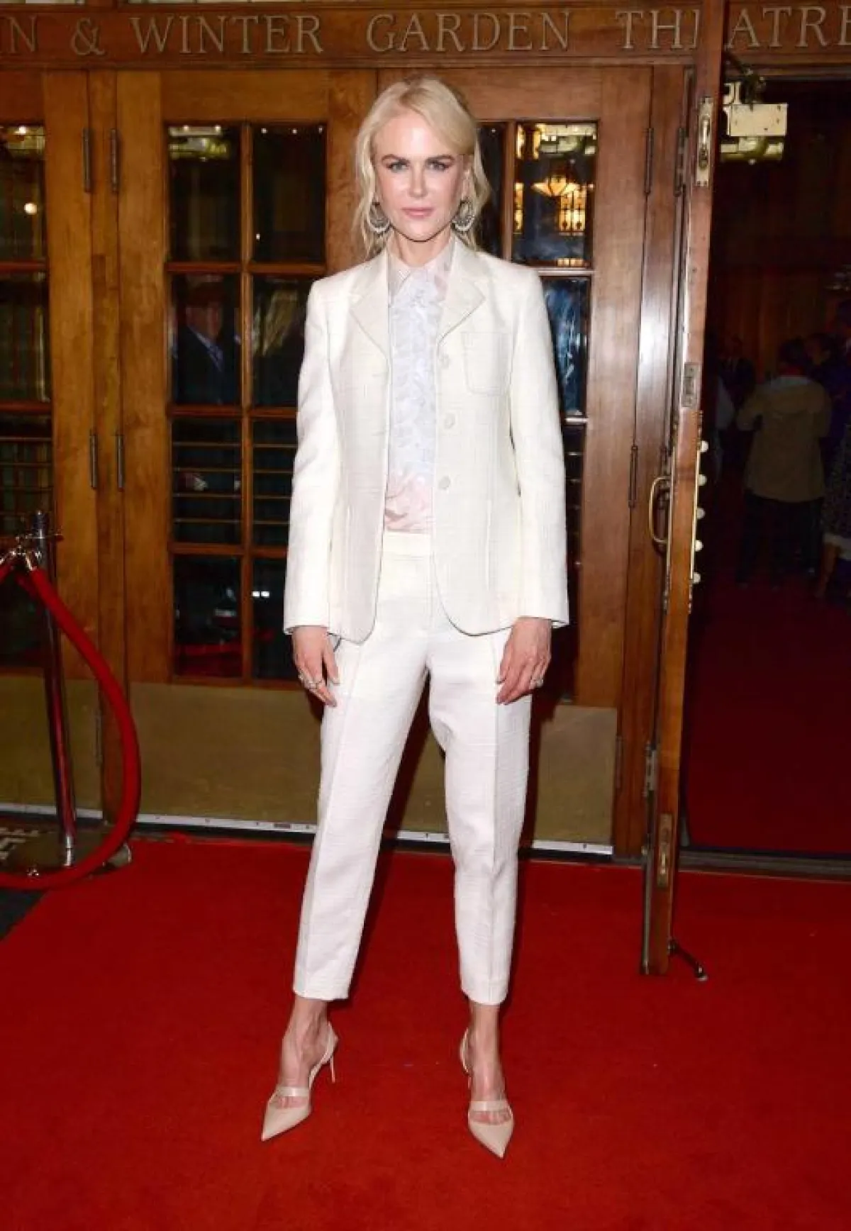 أما نيكول كيدمان Nicole Kidman فقد اختارت الأبيض على تصميم بدلة رسمية مستوحاة من البدلات الرجالية، ونسقت معها قميصًا مزيّنًا بالكشكش الناعم باللون الأزرق الفاتح، وحذاءً بكعب عالٍ من الجلد باللون البيج.