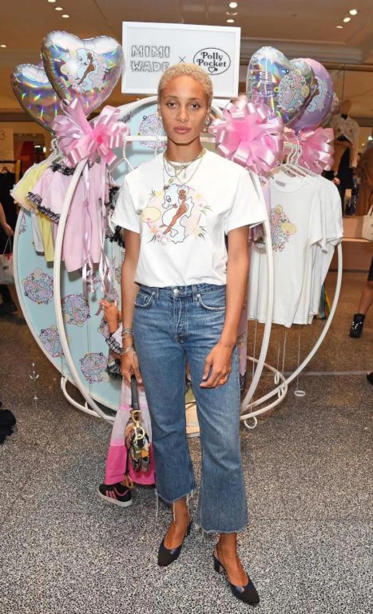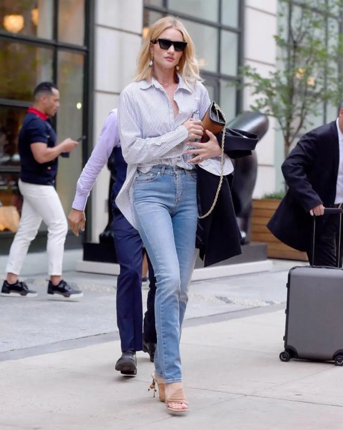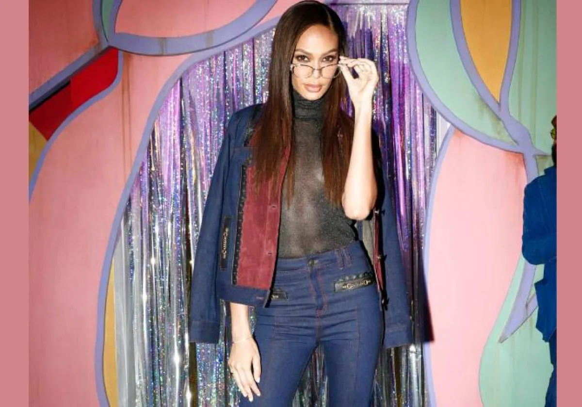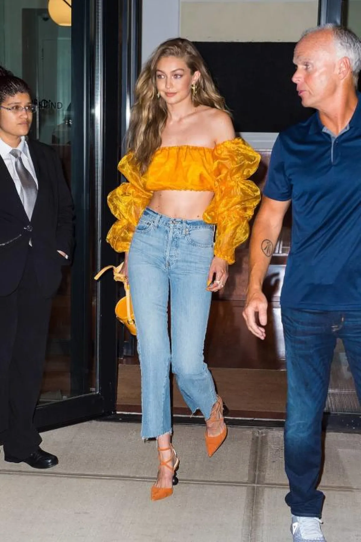 تعشق جيجي حديد Gigi Hadid الجينز، وفي هذه الاطلالة اختارته بقصة مستوحاة من الثمانينيات بخصر عالٍ، ونسقته مع توب من الأورغانزا مكشوفة الأكتاف باللون البرتقالي، وأكملت اللوك بحذاء وشنطة يد من لون القميص نفسه الذي اختارته.