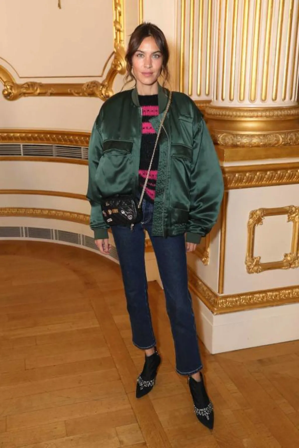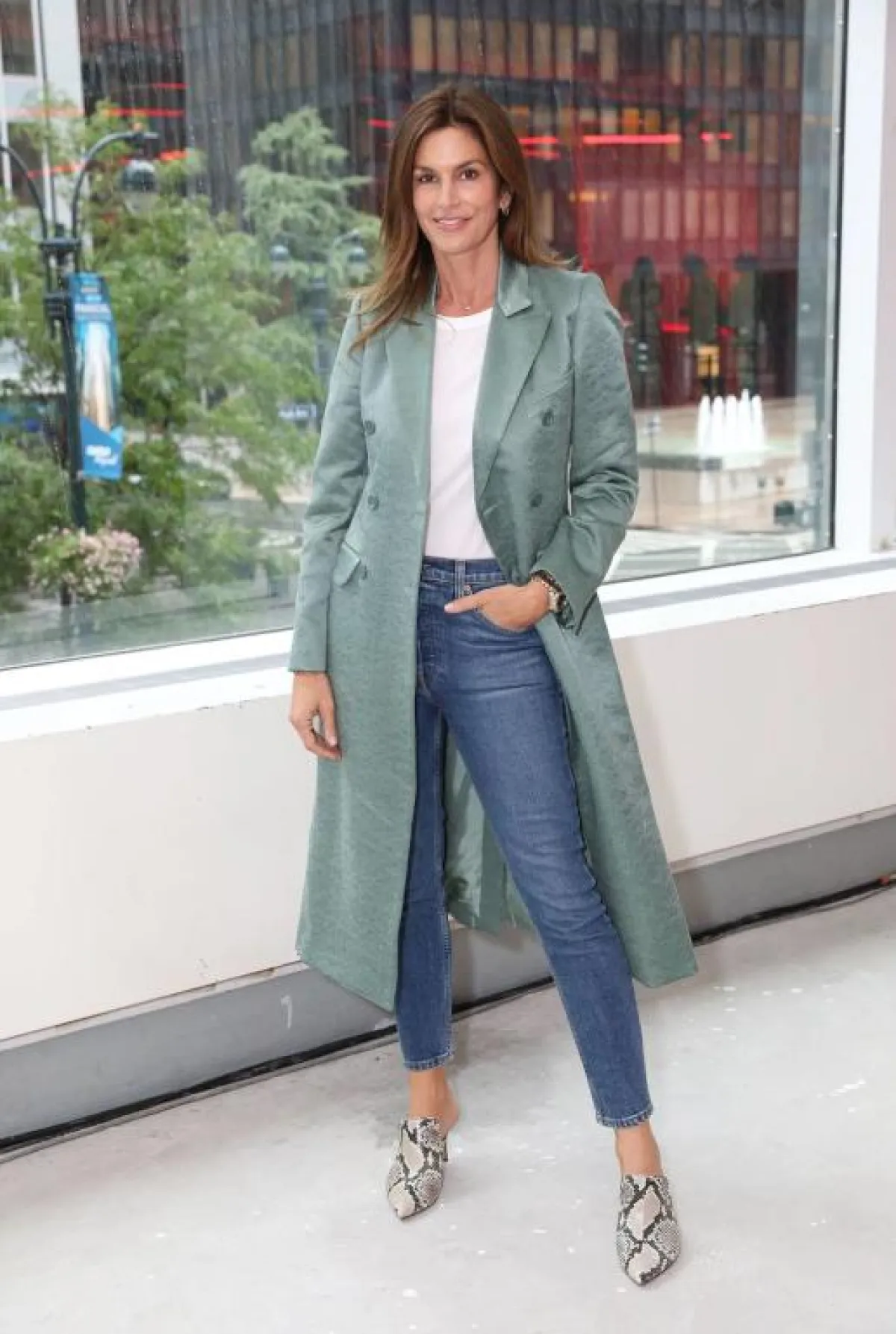 اختارت سيندي كراوفورد Cindy Crawford اطلالة أنيقة في الجينز الأزرق، حيث نسقته مع توب باللون الأبيض، ومعطف طويل باللون الأخضر الرمادي، وأكملت الاطلالة بحذاء من جلد بنقشة جلد الأفعى.