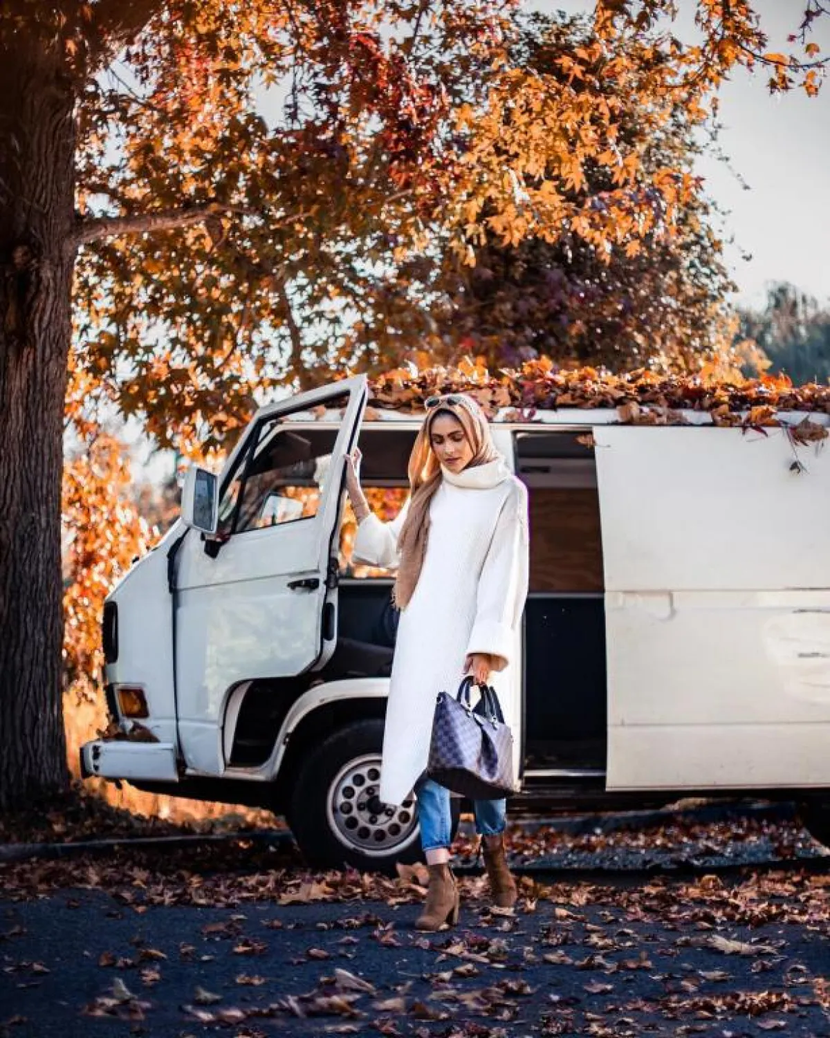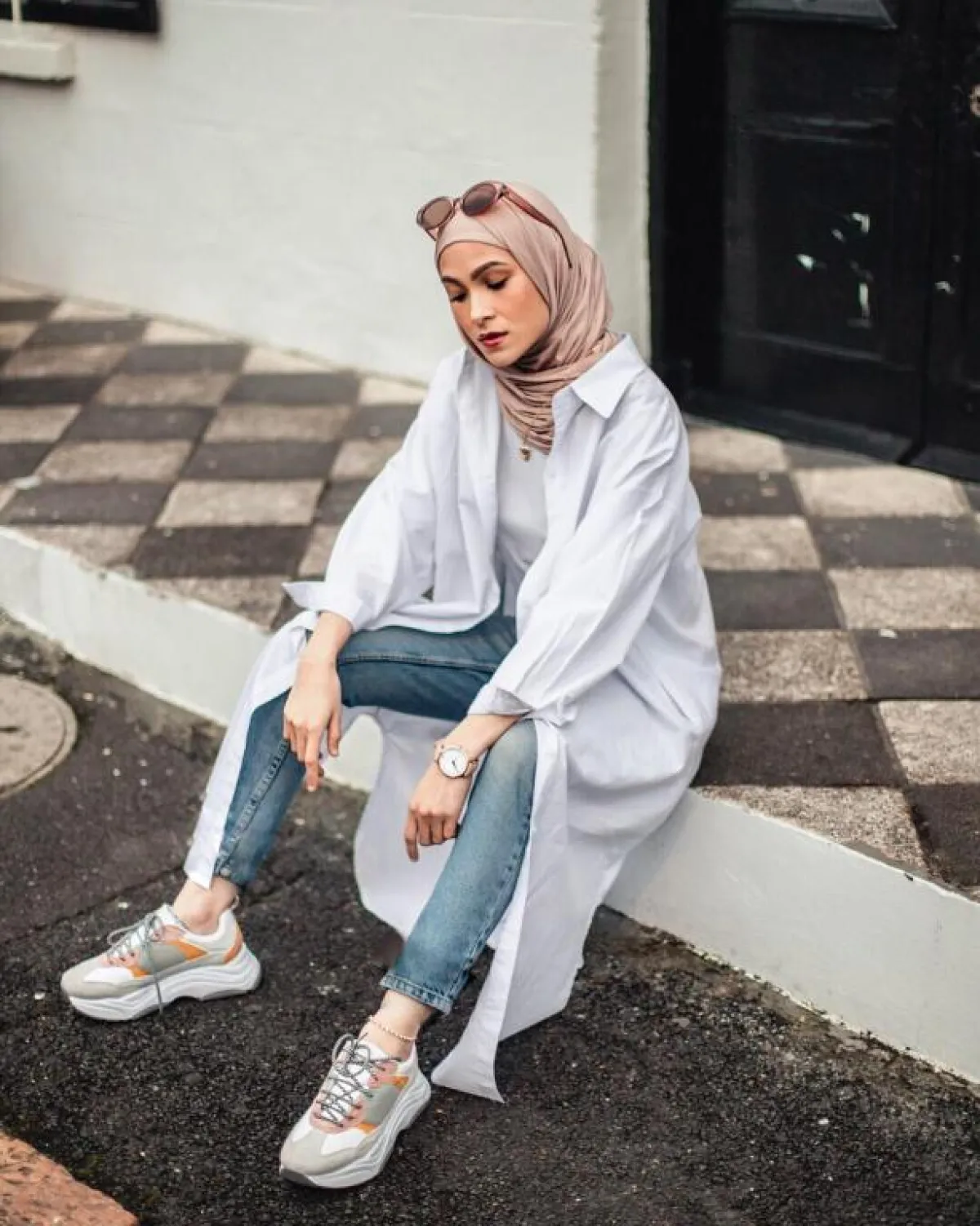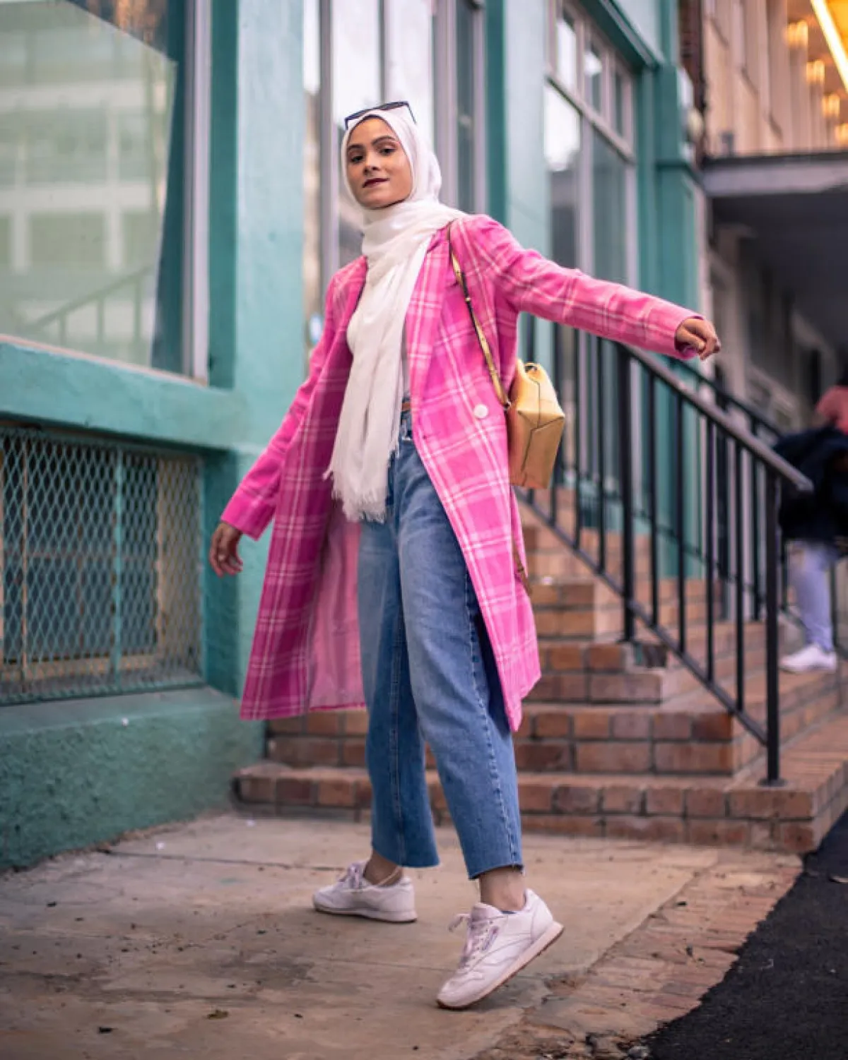 نسقت الفاشينيستا ملابسها جاكيت طويل كاروه أشبه بالمعطف مع بنطلون جينز وtop أبيض، وانتعلت حذاءً رياضياً باللون نفسه.