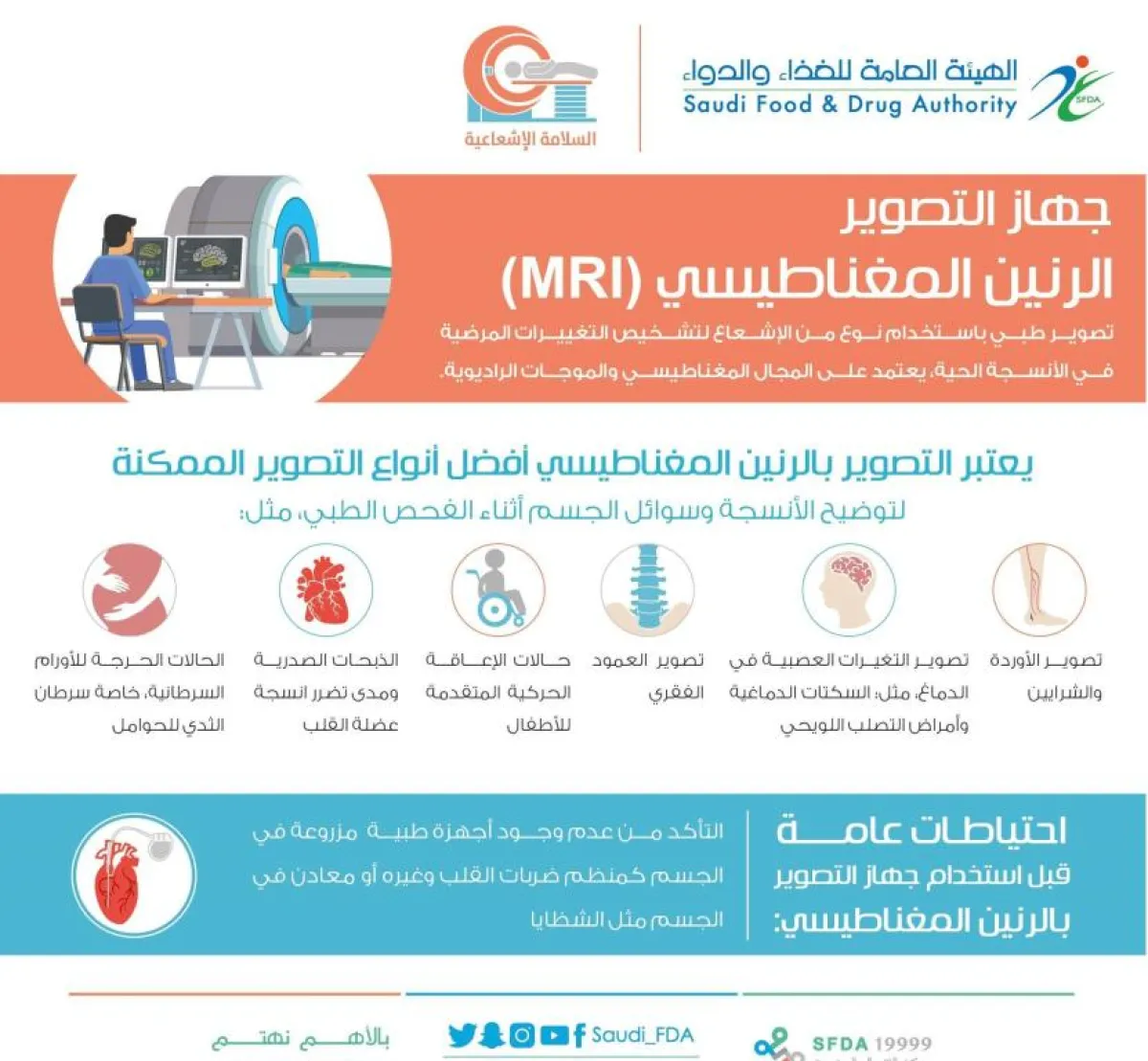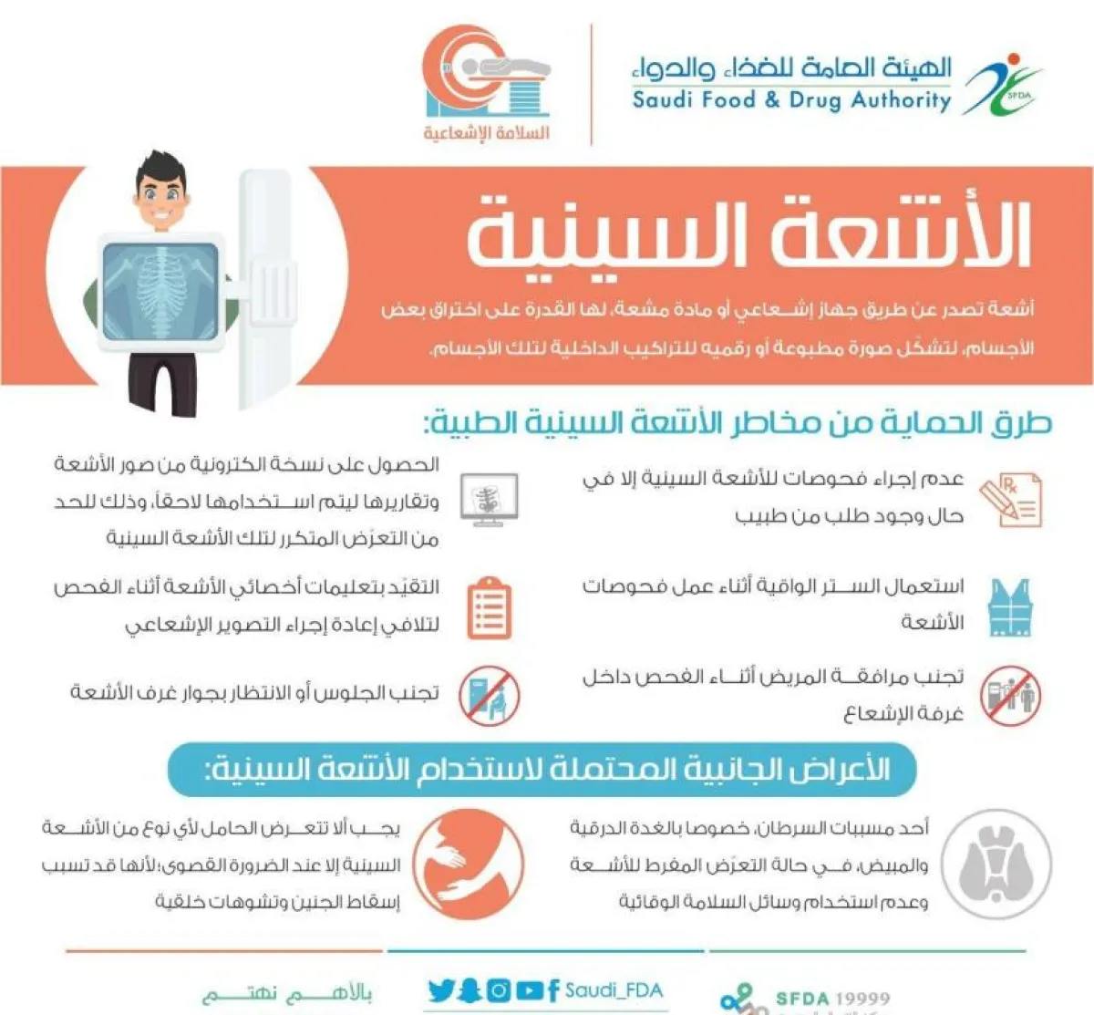 ومن جهته فقد أكد المدير التنفيذي للتواصل والتوعية بالهيئة الصيدلي عبدالرحمن السلطان، على ضرورة إبلاغ المرأة للطبيب قبل إجراء الأشعة إذا كانت حاملاً أو تشك بالحمل، علماً أن الأشعة فوق الصوتية والرنين المغناطيسي آمنة للحامل، كما أكد على ضرورة الحرص على ارتداء السترة الواقية من الأشعة لحماية أعضاء الجسم غير المستهدفة بالتصوير، مع تفضيل عدم دخول مرافق المريض إلى غرفة الأشعة إلا في حالة الضرورة أو يرتدي السترة الواقية من الأشعة، وشدد على أهمية الحصول على صور الأشعة وتقاريرها، للحد من التعرض المتكرر للأشعة.