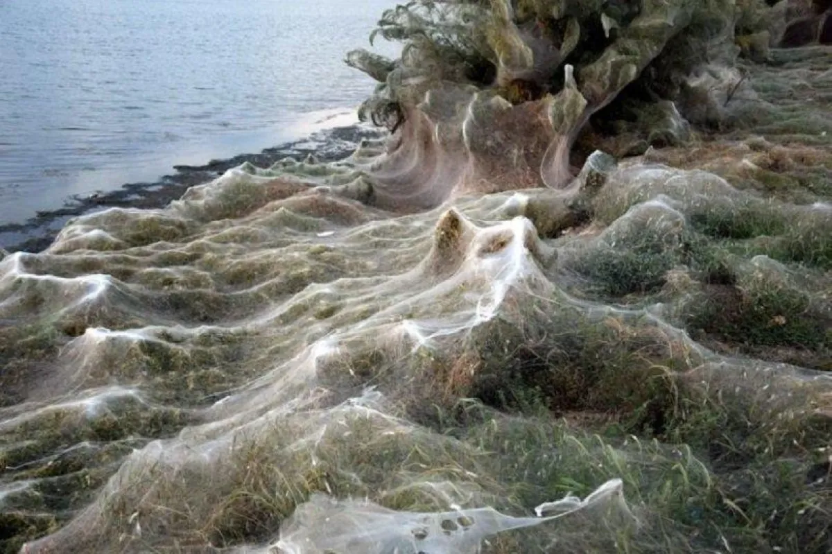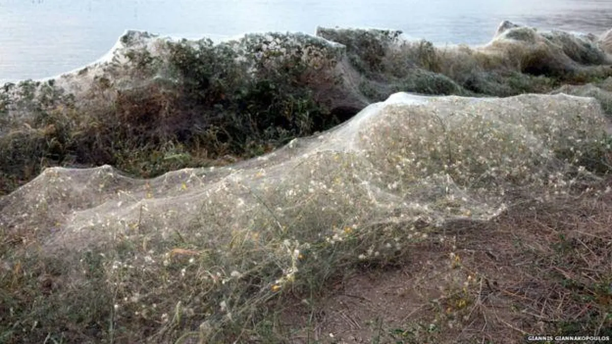 في ظاهرة غريبة ومُفزعة اجتاحت آلاف العناكب المنطقة الساحلية لمدينة "أيتوليكو" اليونانية وغطتها بنسيج عنكبوت عملاق يبلغ طوله 300 متر.