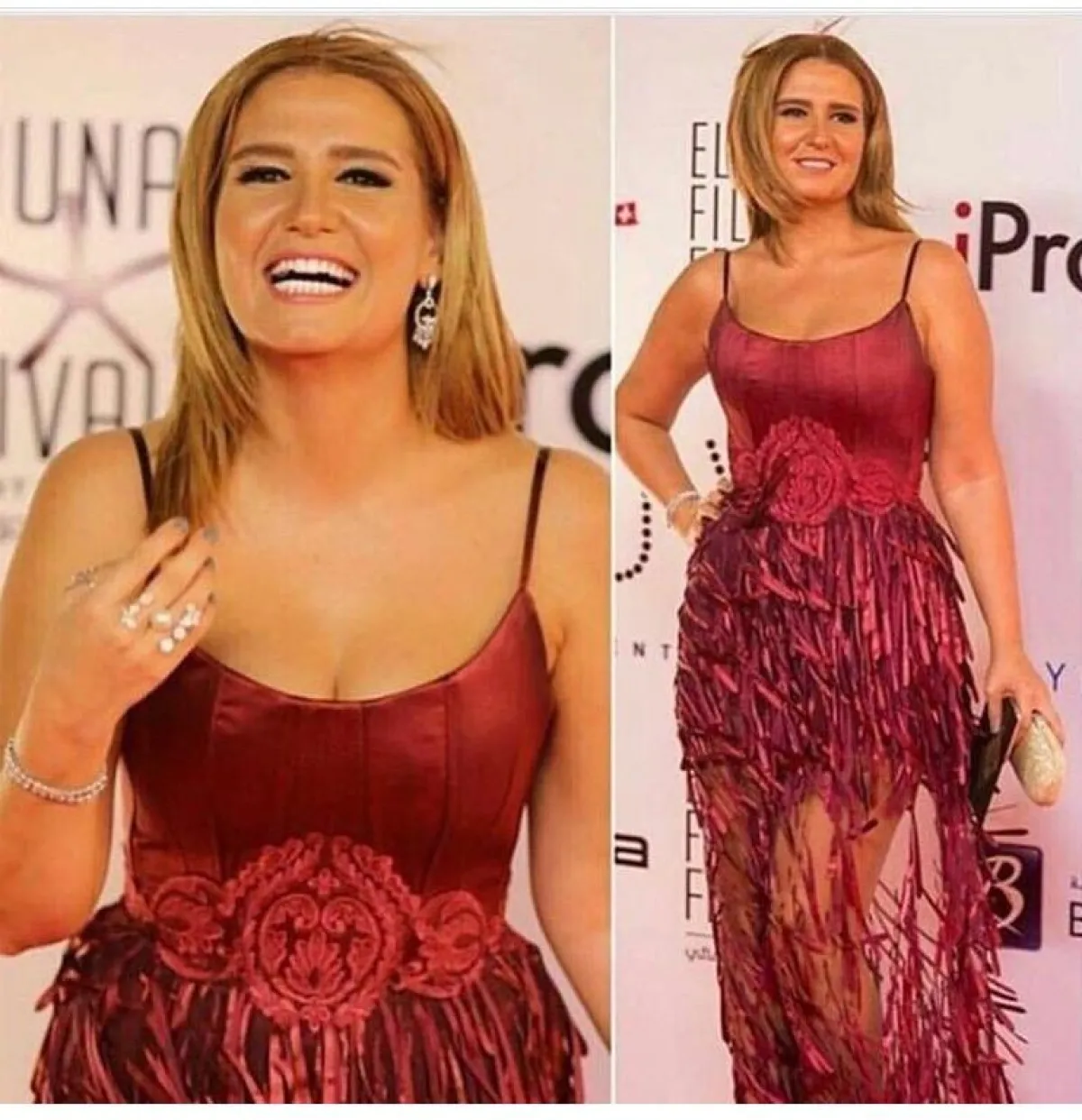 بخامة الفيلفت ظهرت هنا شيحة بإحدى المهرجانات بفستان عنبي، بكورسيه ضيّق مفتوح من ناحية الصدر، ورسومات من عند الخصر، مثالي للمرأة التي تحمل جسم التفاحة، بخاصة وأنّ الشراشيب تخفي الأرداف إن كانت ممتلئة.