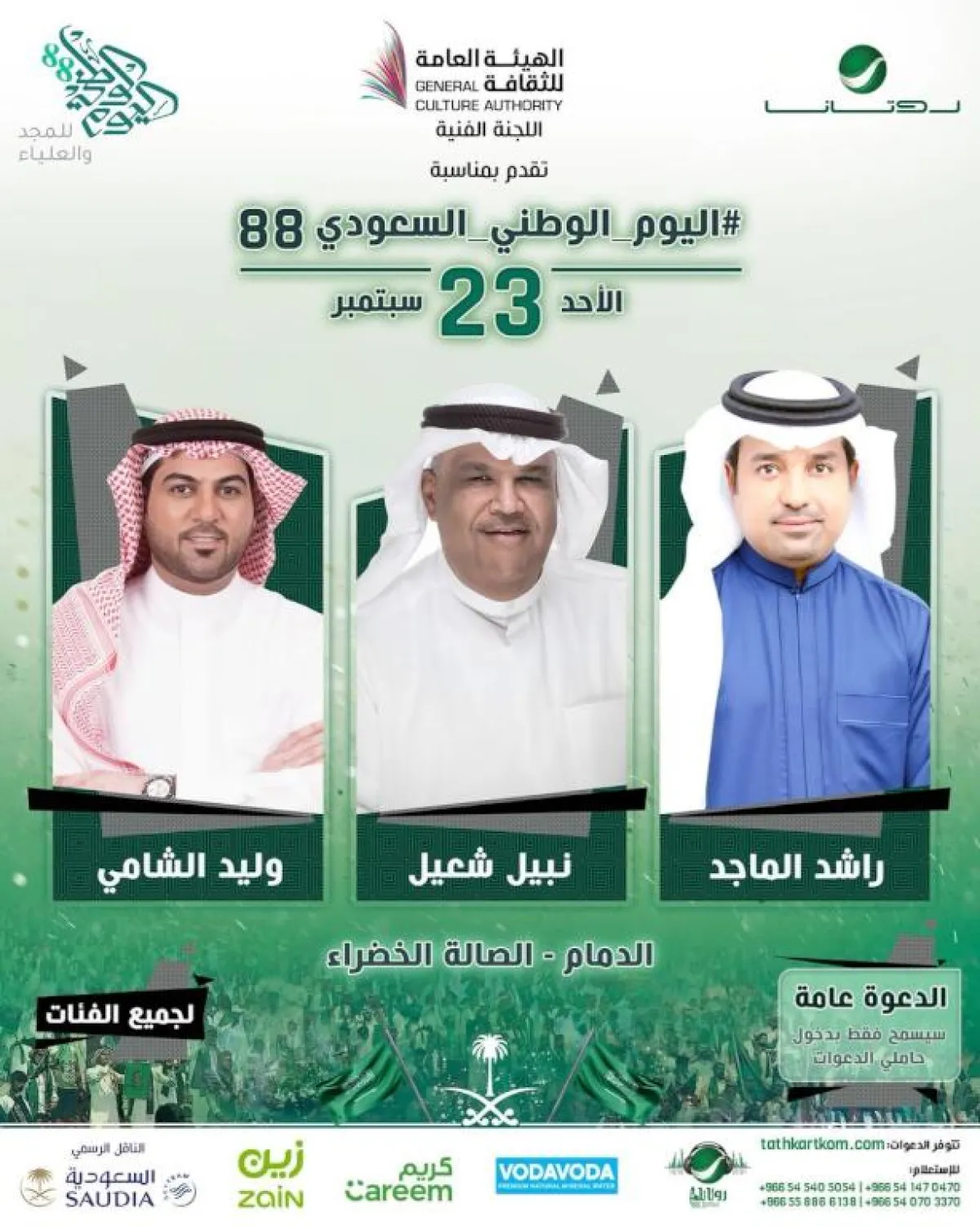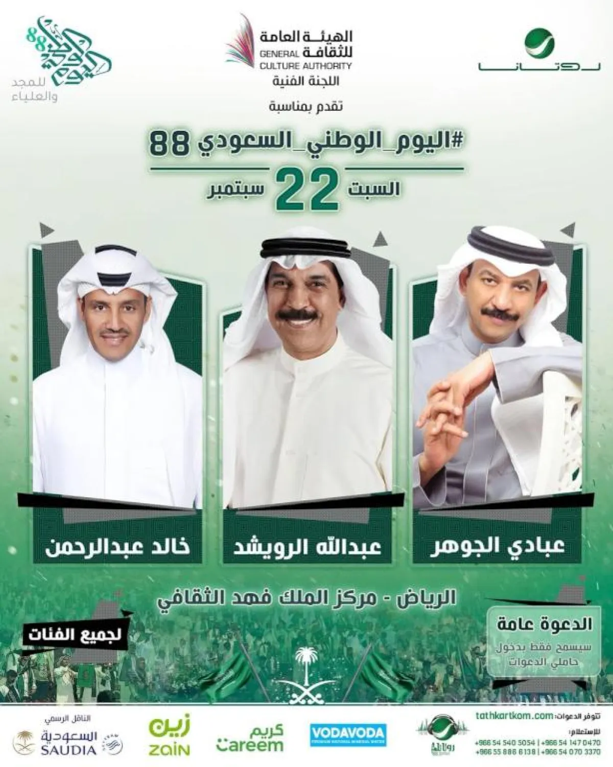 يترقب الجمهور السعودي المتذوق للفن الحفلات الغنائية بمناسبة اليوم الوطني السعودي، بكل شغف ومحبة وروح وطنية عالية، احتفاءً بهذه المناسبة التي تأتي بتاريخ 23 من سبتمبر في كل عام، وطرحت روتانا للصوتيات والمرئيات الشركة المنظمة للحفلات الغنائية باليوم الوطني، موعد إصدار التذاكر المجانية للحضور، وسبق موعد طرح الدعوات تغريدة مُطْلَقَة من الحساب الرسمي لروتانا على منصة حساباتها الرسمية في تويتر وانستقرام، منوهة بأن الدعوات ستصدر قريبًا، مشوقة بذلك الجماهير.