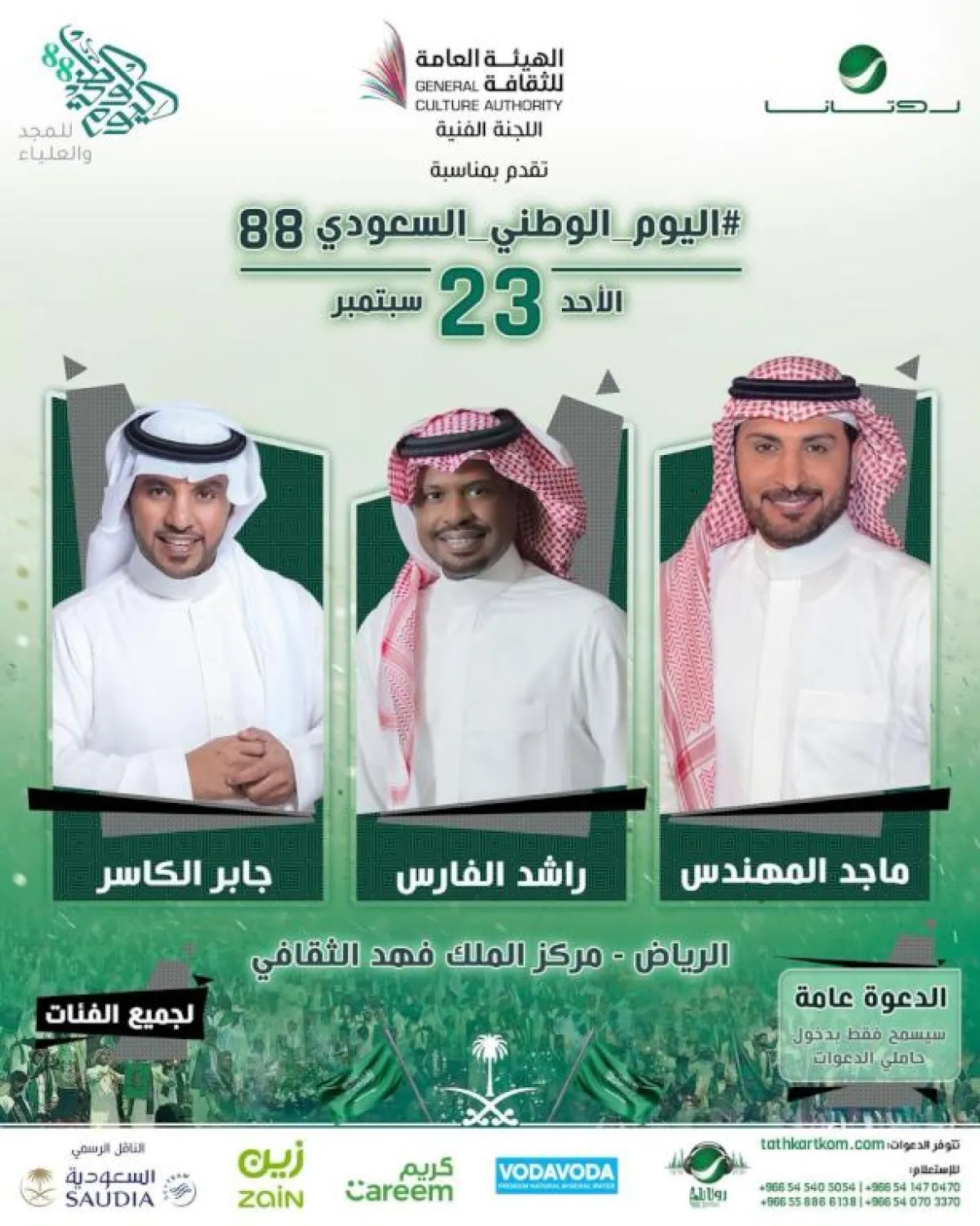 حفلة الفنانين عبادي الجوهر، وخالد عبد الرحمن، وعبد الله الرويشد، التي ستقام بالرياض بتاريخ 22 سبتمبر، وبعدها تمَّ طرحُ تذاكر الحفلة الثانية للفنانين ماجد المهندس وراشد الفارس وجابر الكاسر، في حين طُرِحَت تذاكر الحفلة الثالثة التي سيحييها راشد الماجد، ووليد الشامي، وعايض.