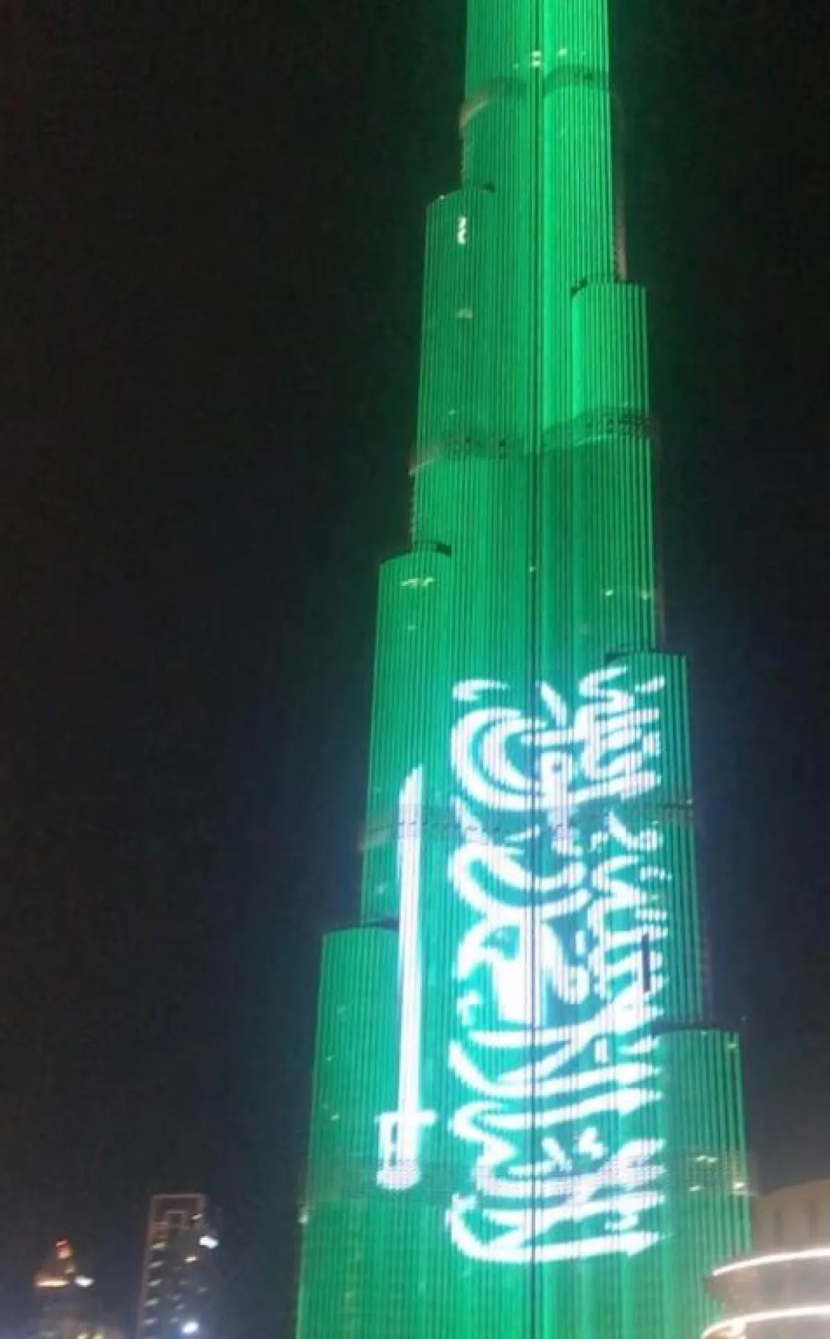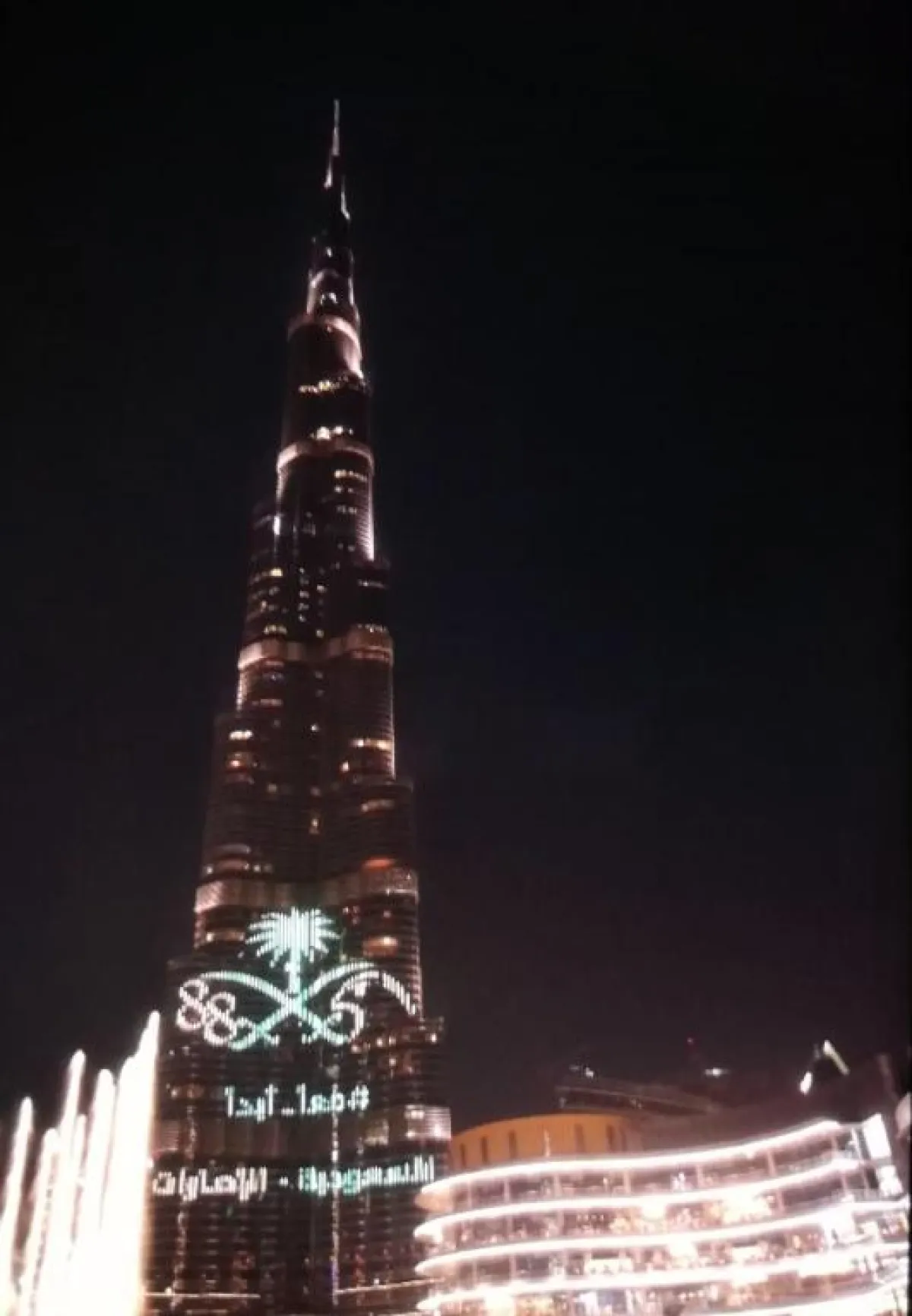 وأُضيء برج خليفة بألوان العلم السعودي، كما قدمت نافورة "دبي" عرضها الراقص على أنغام النشيد الوطني السعودي، وقد اكتظ المكان بحشود من الزوار والأشقاء السعوديين المقيمين أو الوافدين للاستمتاع بأجواء الاحتفالات بهذه المناسبة.