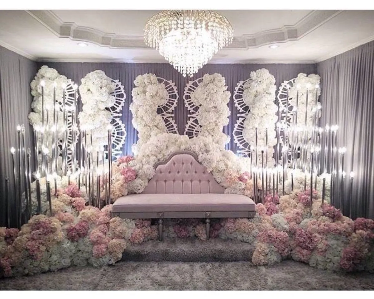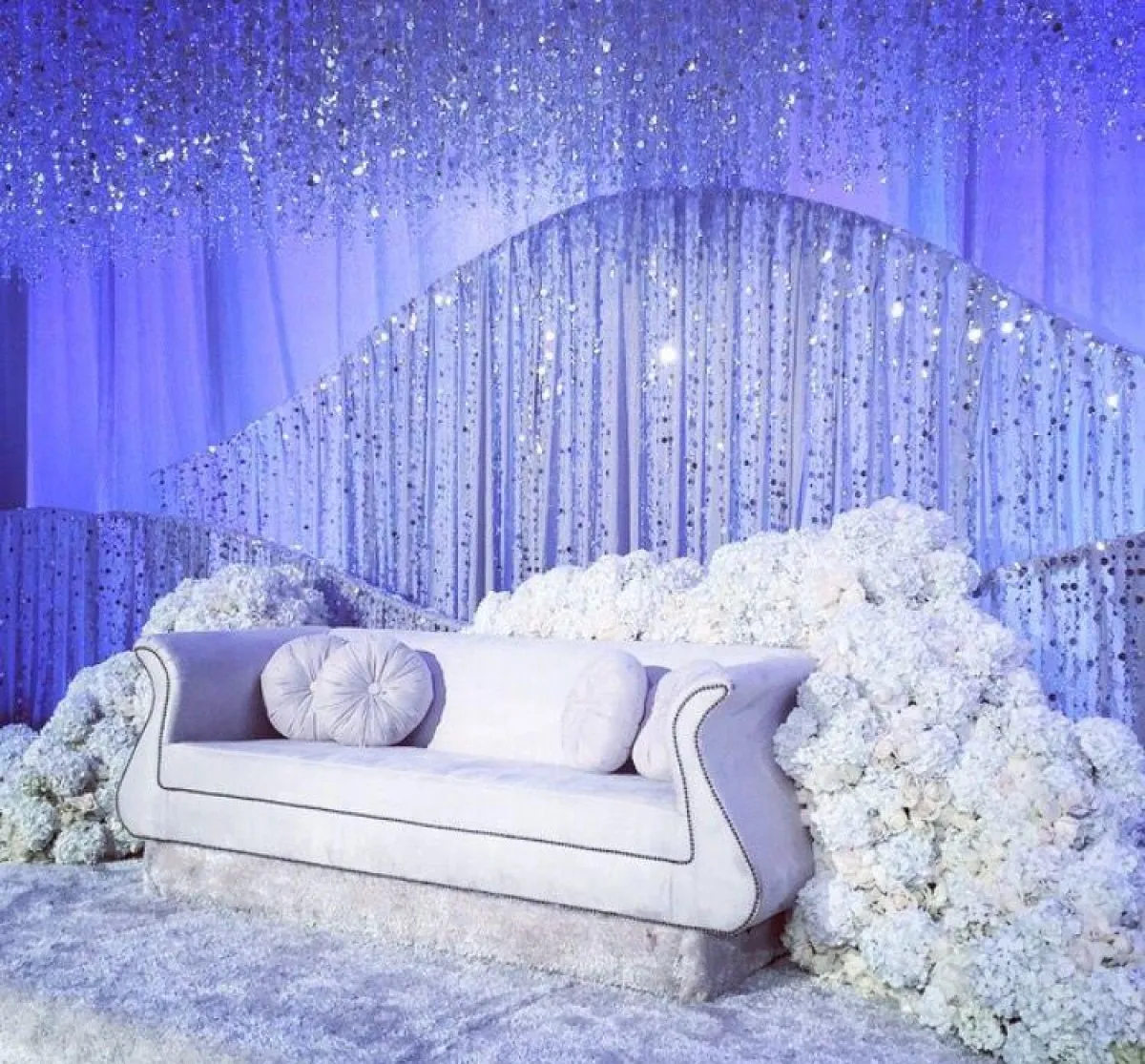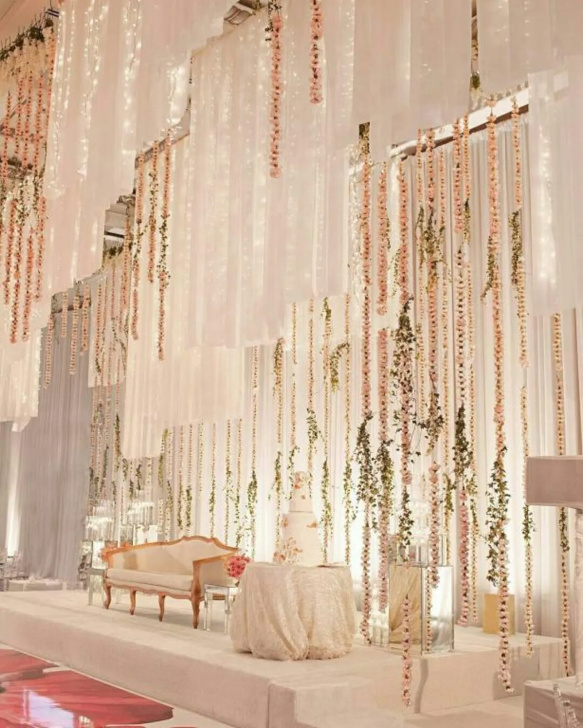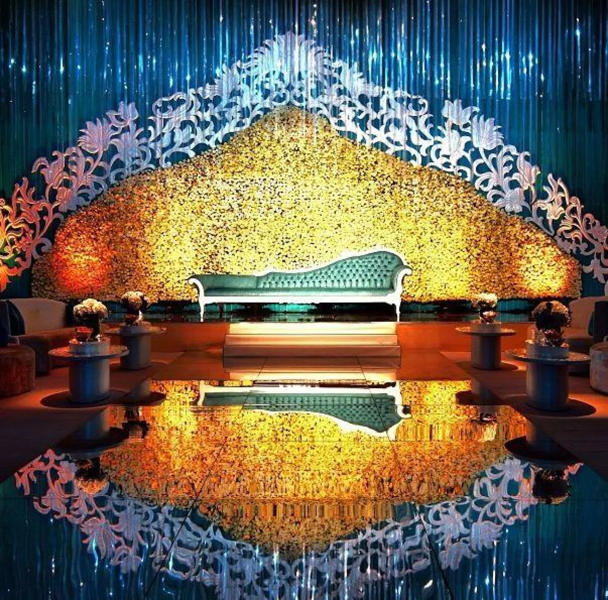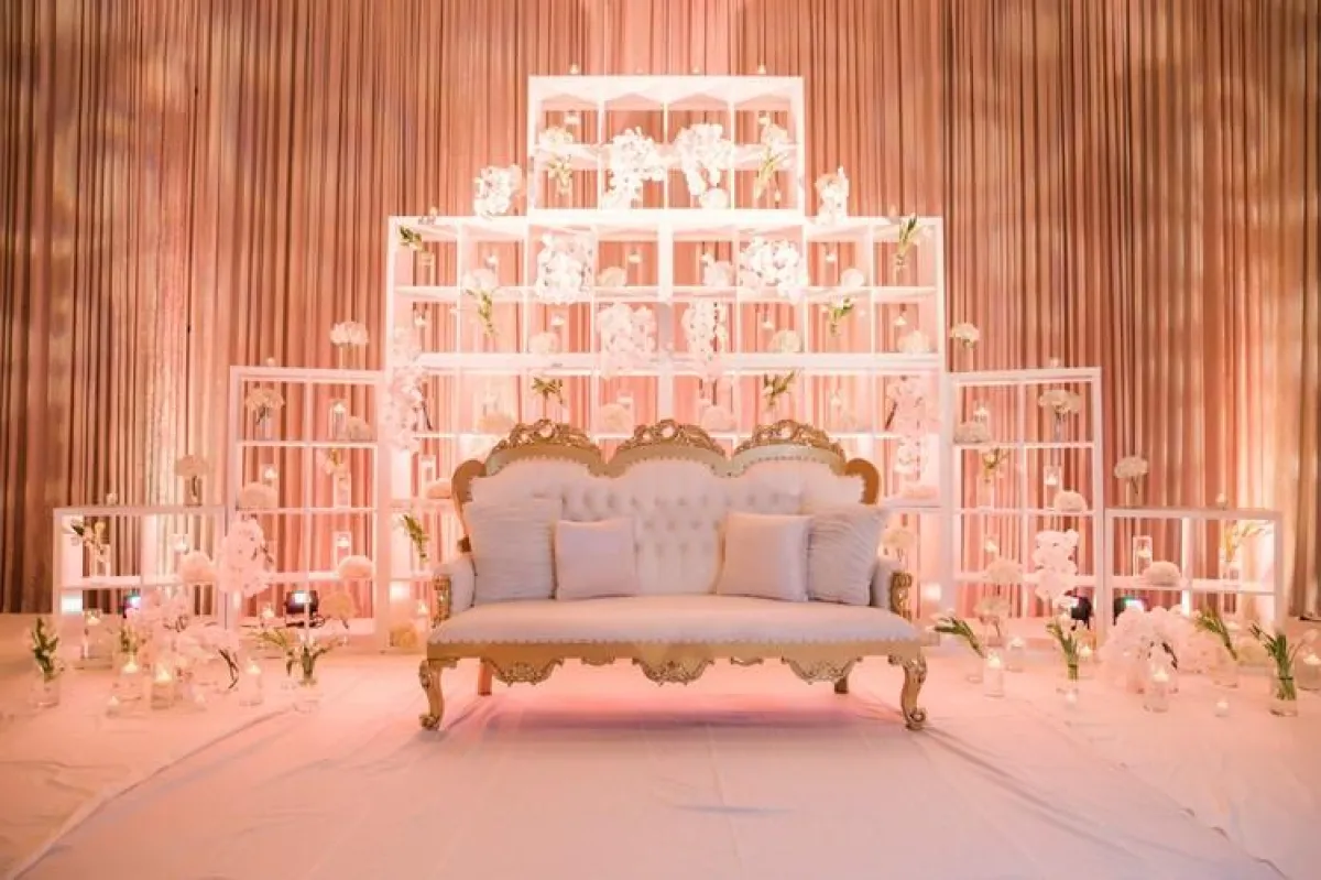 لاطلالة أكثر فخامة، ننصحكِ باعتماد الورود المنسدلة من السقف على كلا الجانبين، وأن تضعي التول على الأرض مع باقات الورود المخملية، واعتمدي دائمًا على الإضاءة الصفراء التي تضيف أجواءً رومانسية.