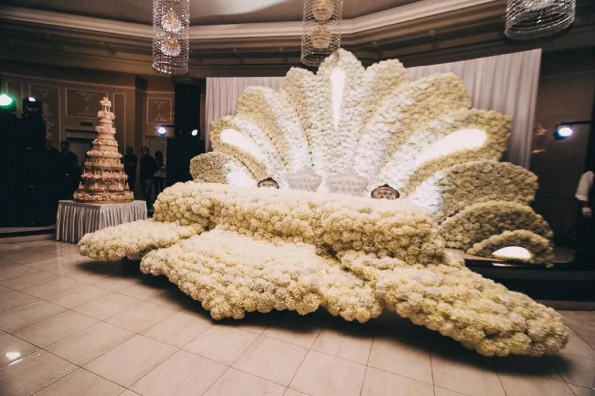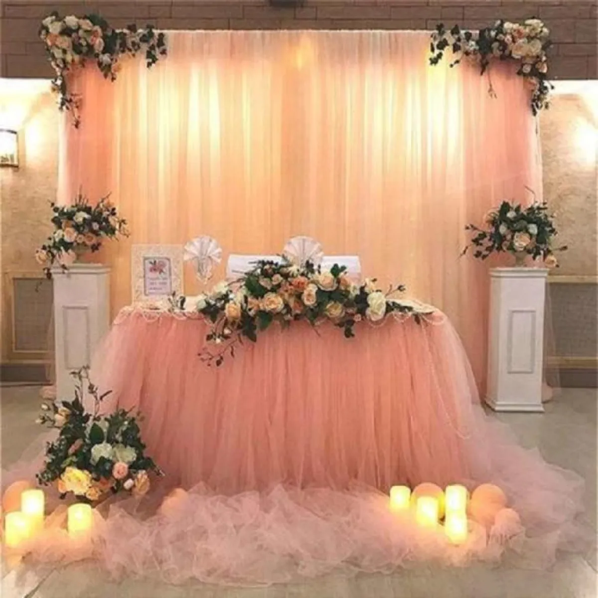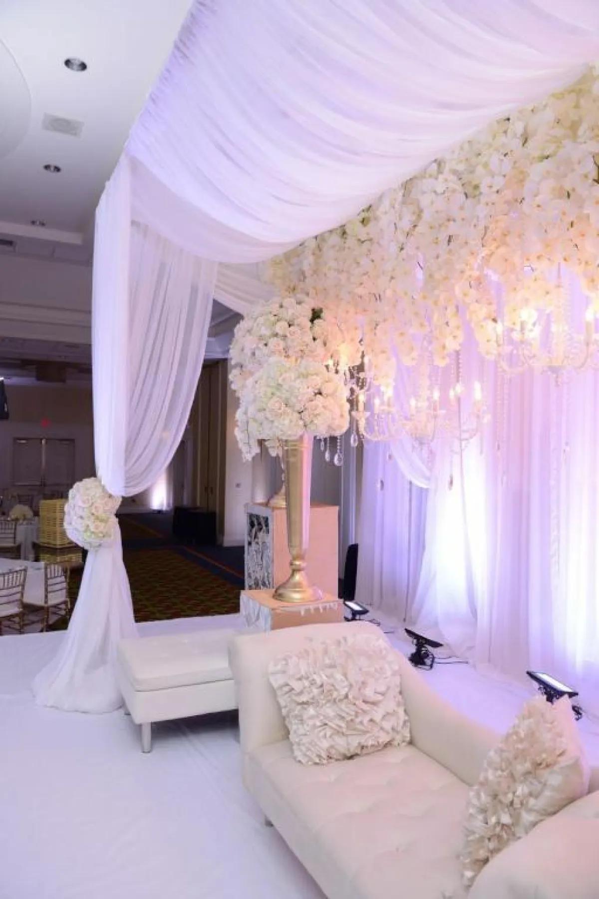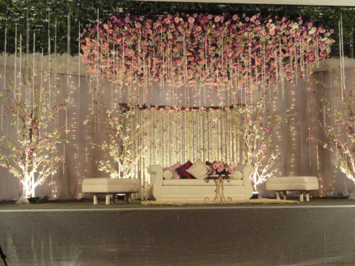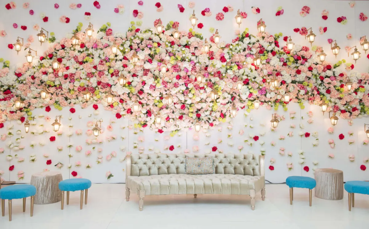 لاطلالة أكثر فخامة، ننصحكِ باعتماد الورود المنسدلة من السقف على كلا الجانبين، وأن تضعي التول على الأرض مع باقات الورود المخملية، واعتمدي دائمًا على الإضاءة الصفراء التي تضيف أجواءً رومانسية.