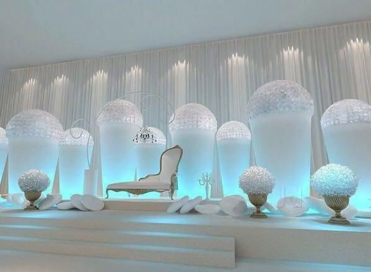 الشموع هنا تلعب دورًا كبيرًا في تزيين كوش الأفراح، ضعيها بأحجام مختلفة، لكن ابعديها عن التول تمامًا حتى لا يحدث مشاكل، أو يمكنكِ الاعتماد على الإضاءة الصفراء التي تضيف أجواءً أكثر رومانسية.