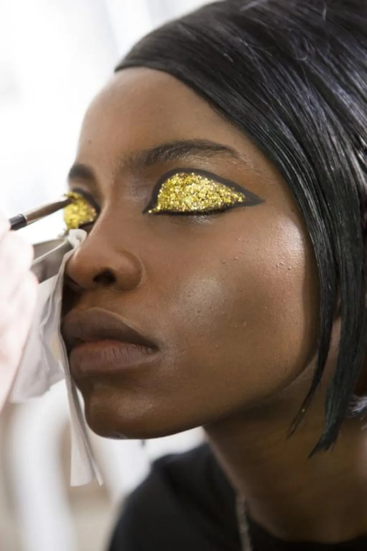 يبدو أن الغليتر سيكون من أبرز صيحات مكياج ربيع 2019، حيث طغت على العروض أساليب الـمكياج الجريئة المعتمدة على الغليتر والتي رصدناها لدى Halpern، Jimmy Scott، Kate Spade . كما وسيطر الغليتر بقوّة على عيون عارضات Simone Rocha.