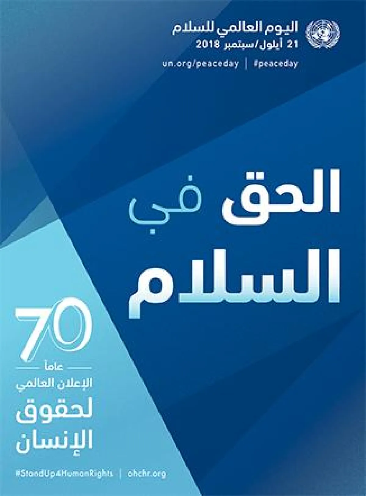 واختارت الأمم المتحدة موضوع اليوم العالمي للسلام للعام 2018، والذي جاء تحت عنوان «الحق في السلام - 70 عامًا منذ إقرار الإعلان العالمي لحقوق الإنسان»، والذي أُشير إلى أن المراد منه هو الاحتفاء بالإعلان العالمي لحقوق الإنسان، الذي يمثل وثيقة تاريخية فيما يخص هذا الشأن، حيث كانت الجمعية العامة للأمم المتحدة قد اعتمدت الإعلان الذي صاغه ممثلون من ثقافات ومرجعيات قانونية مختلفة من كل أنحاء العالم، في العاصمة الفرنسية باريس، بتاريخ 10 كانون الأول / ديسمبر من العام 1948، بوصفه معيارًا عامًا للإنجاز أمام كل الشعوب والأمم. وأكدت الأمم المتحدة، عبر موقعها الرسمي، أن هذا الإعلان العالمي يُتاح بأكثر من 500 لغة مختلفة من العالم، ولم يزل ذا صلة بواقعنا اليوم كما كان يوم تم اعتماده.