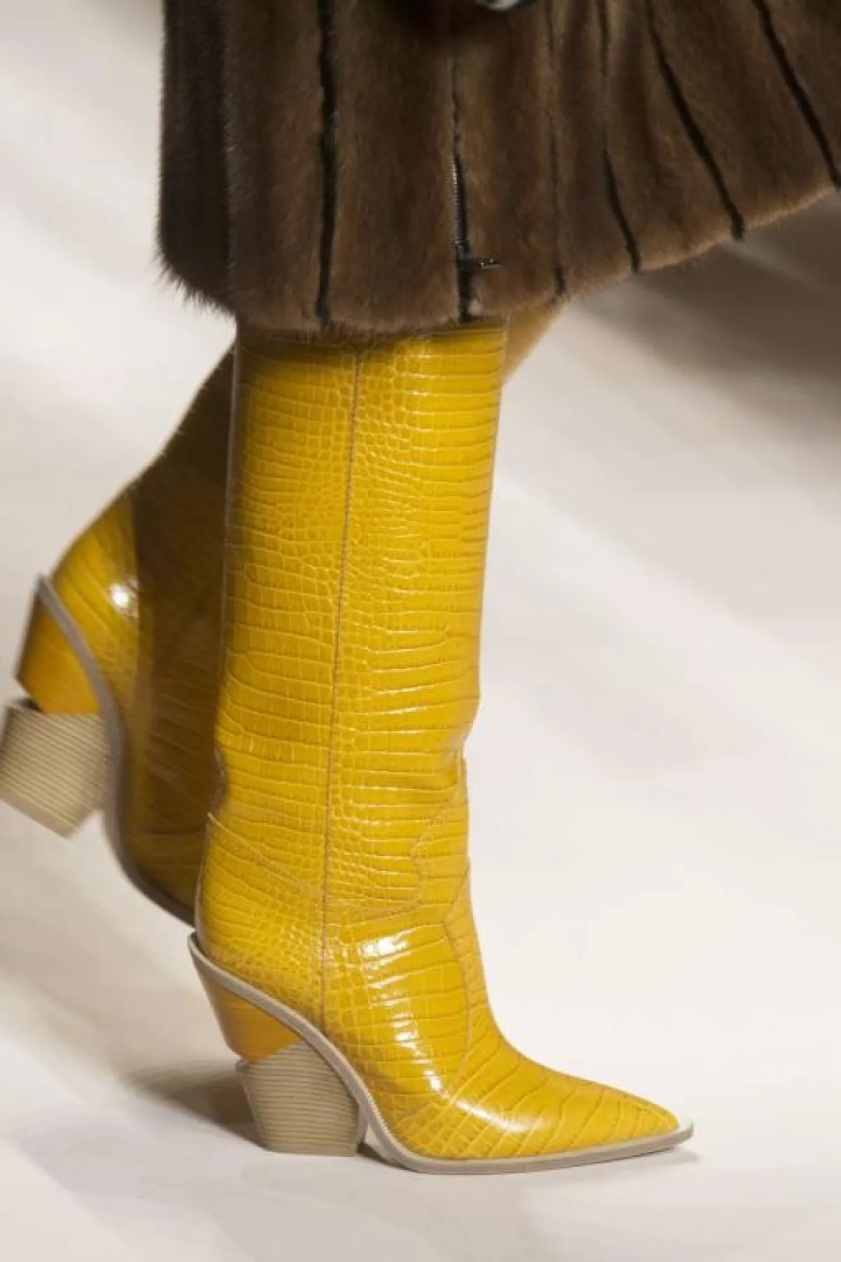 رسومات الحيوانات سوف تجدينها بشكل قوي هذا العام، تحديدًا في الفساتين، لهذا اخترنا هذا البوت من Fendi فيندي باللون الأصفر المستردة مستوحى من جلد الثعبان، لتنسقيه كمثال مع فستان باللون الأسود أو الأبيض من الرسومات نفسها لإطلالة حيادية، وحقيبة يد مستوحاة من الفكرة نفسها.