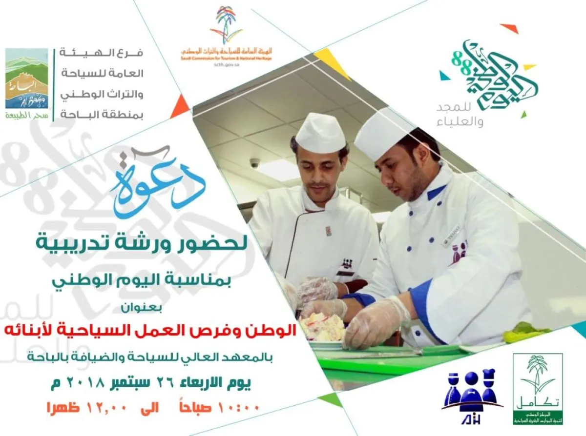 بمناسبة الاحتفاء باليوم الوطني، حيث ينظم المركز الوطني لتنمية الموارد البشرية السياحية (تكامل) غداً الأربعاء ورشة تدريبية تناقش فرص العمل السياحية لابنائه بمقر المعهد العالي للسياحة والضيافة بالباحة.