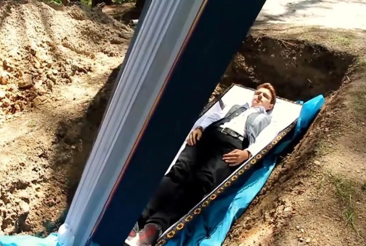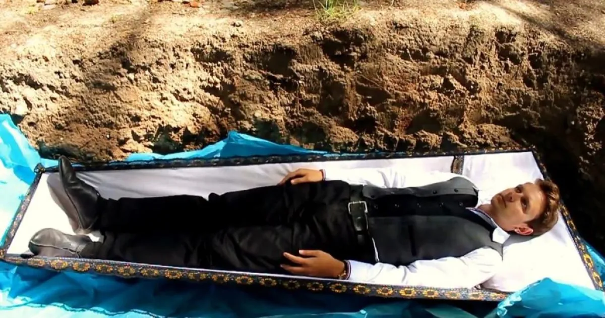 كما ويُظهر الفيديو تابوتاً تم وضعه في مقبرة حديثة، وبداخله يوجد شاب يرتدي قميصاً أبيض اللون. ويمكن رؤية أنبوب خارج من التابوت حتى يتمكن المريض من التنفس خلال فترة العلاج. وقال الطبيب زيليفيترو: "لقد ابتكرت هذا العلاج قبل بضع سنوات، كنت أول شخص خضع له، هذا التدريب يساعدك على الشعور بالحيوية".