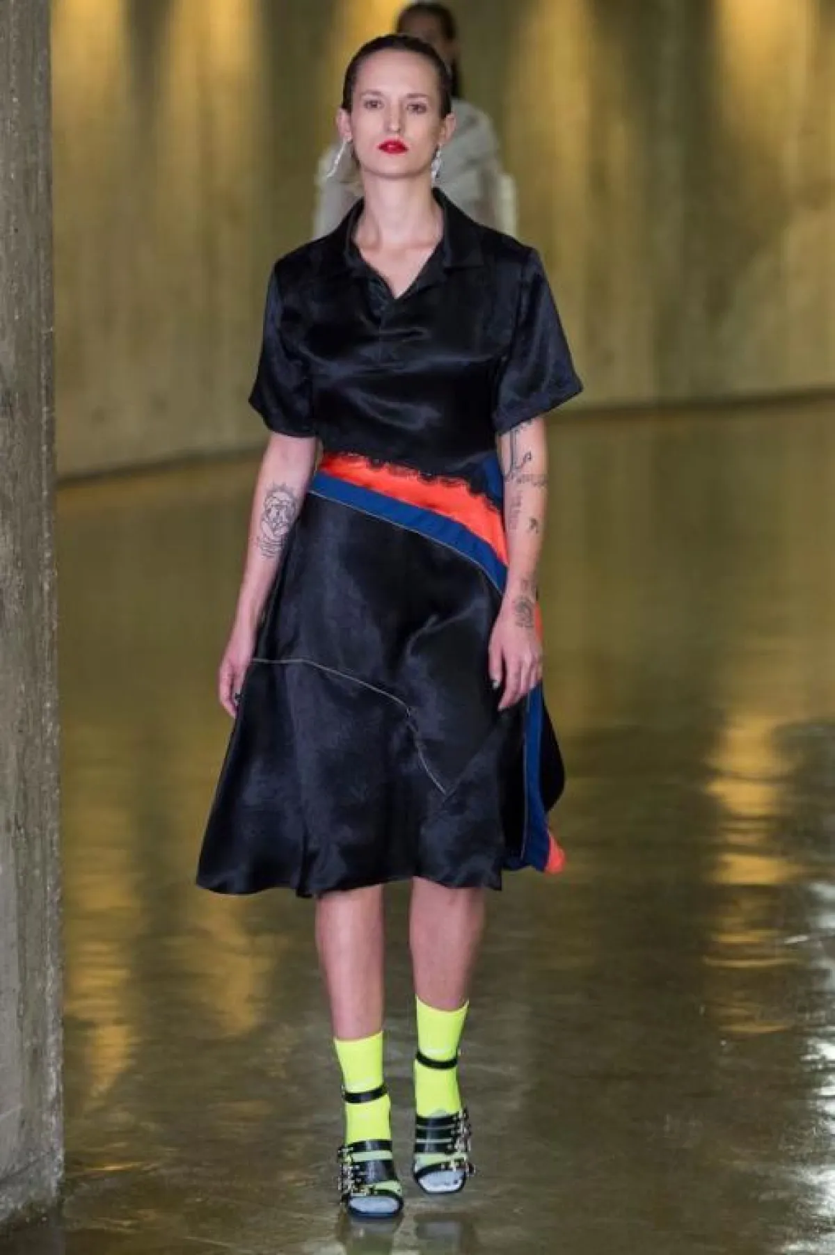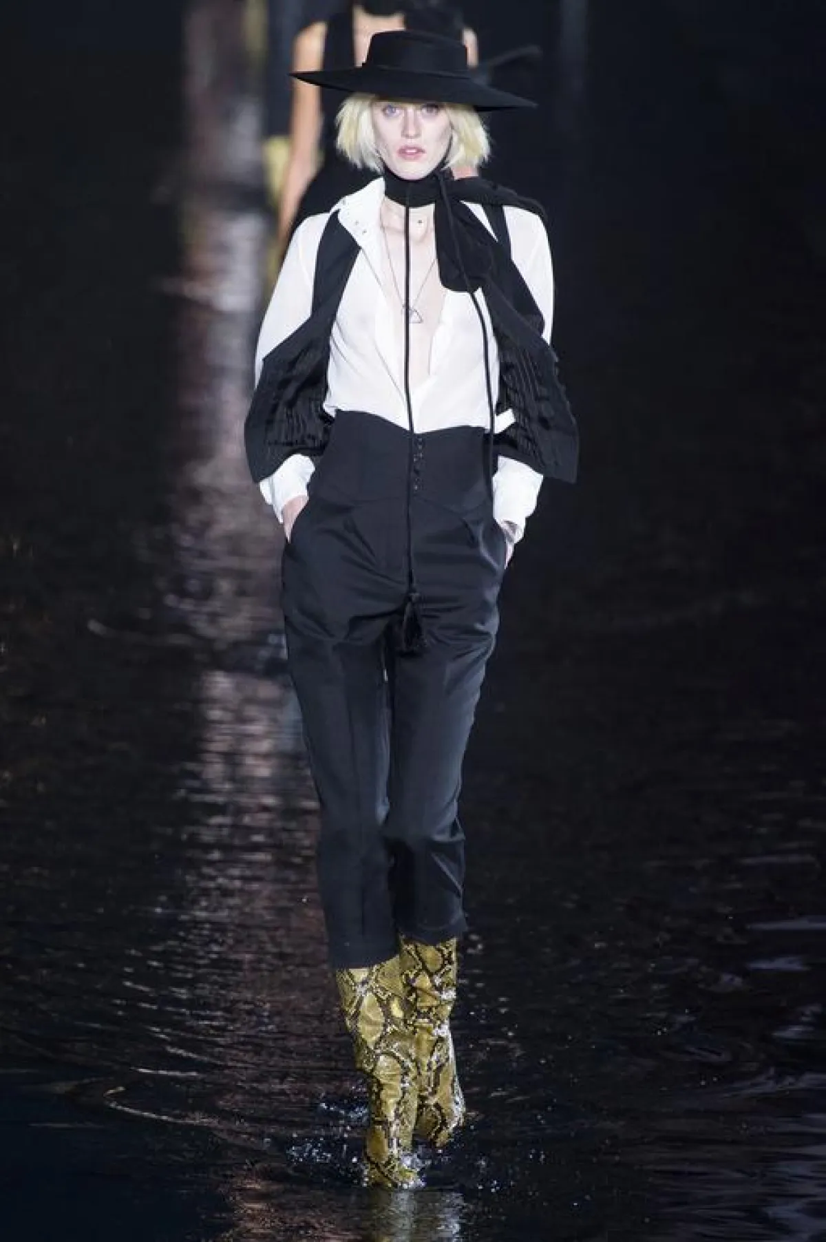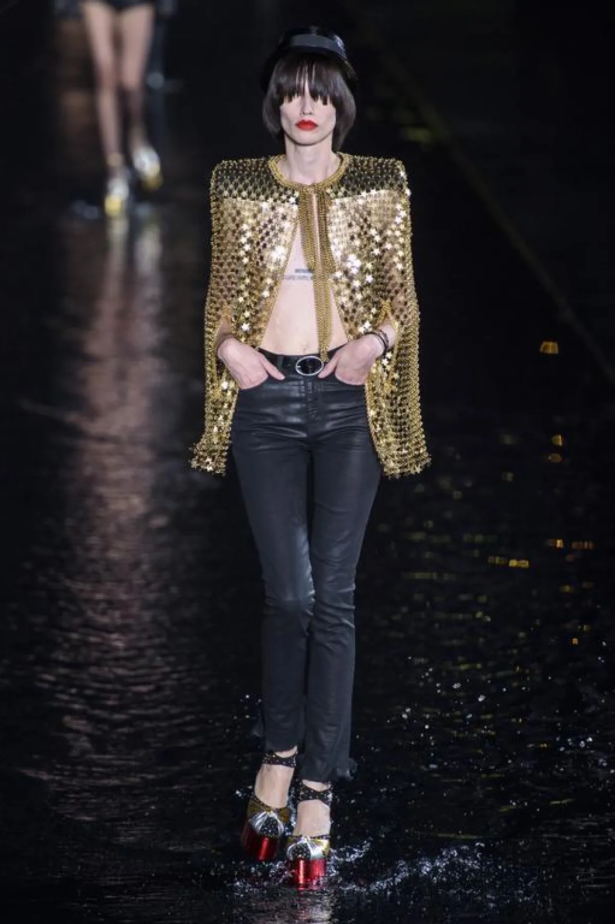 كان عرض سان لوران Saint Laurent العرض الأهم والذي انتظره عشاق الموضة يوم أمس، فعلى ضفاف بحيرة اصطناعية تحذوها أشجار النخيل المضيئة غطت ساحة " تروكاديرو " وبمحاذاة برج ايفل، تهادت العارضات بخطوات جريئة وبأزياء غاية في الأنوثة ، بقي المصمم البلجيكي أنطوني فاكاريلو Anthony vaccarello وفيا لهوية الدار ، حيث طغى اللون الأسود على العرض ، أما الأزياء فتنوعت ما بين التايورات ذات الجاكتات المحددة التفاصيل الا أن البنطالون ع عوض بشورتات قصيرة من الجلد و الدنيم والتي غلبت على معظم اطلالات العارضات ،كما عرض مجموعة من الفساتين القصيرة التي زينها بتفاصيل جمالية راقية أضاءت العرض ، تجسدت في رسومات النجوم الذهبية و الفضية المبعثرة على الفساتين هنا وهناك ، نسقت تارة بصنادل صيفية ذهبية اللون وتارة أخرى بأحذية جلدية عالية ، كما كسر حدة اللون لأسود بلمسة من الألوان الصارخة وخاصة الأحمر والأخضر ، وقد وضع المصمم أنطوني فاكاريلو لمسة من " الهبي شيك " Hippie Chic على العرض تجسدت هذه اللمسة في القبعات وربطات العنق و كذلك أشرطة الرأس ولنظارات الشمسية.