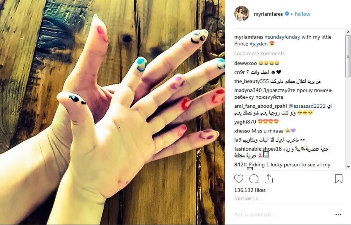 فالفنانة لم تظهر سوى مرة واحدة في صورة مع ابنها جايدن بدت فيها يدها تعانق يد ابنها الملطخة بالألوان. لم يعرف ما إذا كانت الصورة جديدة، أم أن ميريام لا تزال في المستشفى بعيدة عن ابنها كما نشرت بعض الصحف.