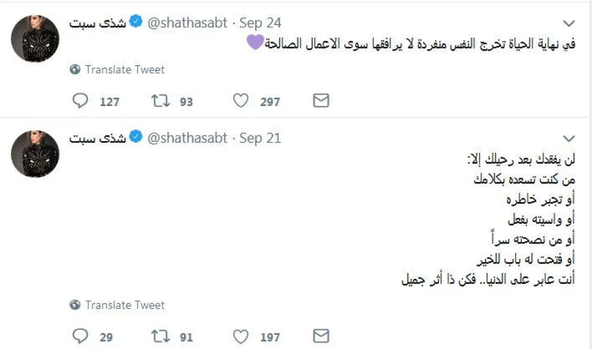 وعادت وختمت تغريداتها بتغريدة مقلقة جاء فيها "في نهاية الحياة تخرج النفس منفردة لا يرافقها سوى الأعمال الصالحة".