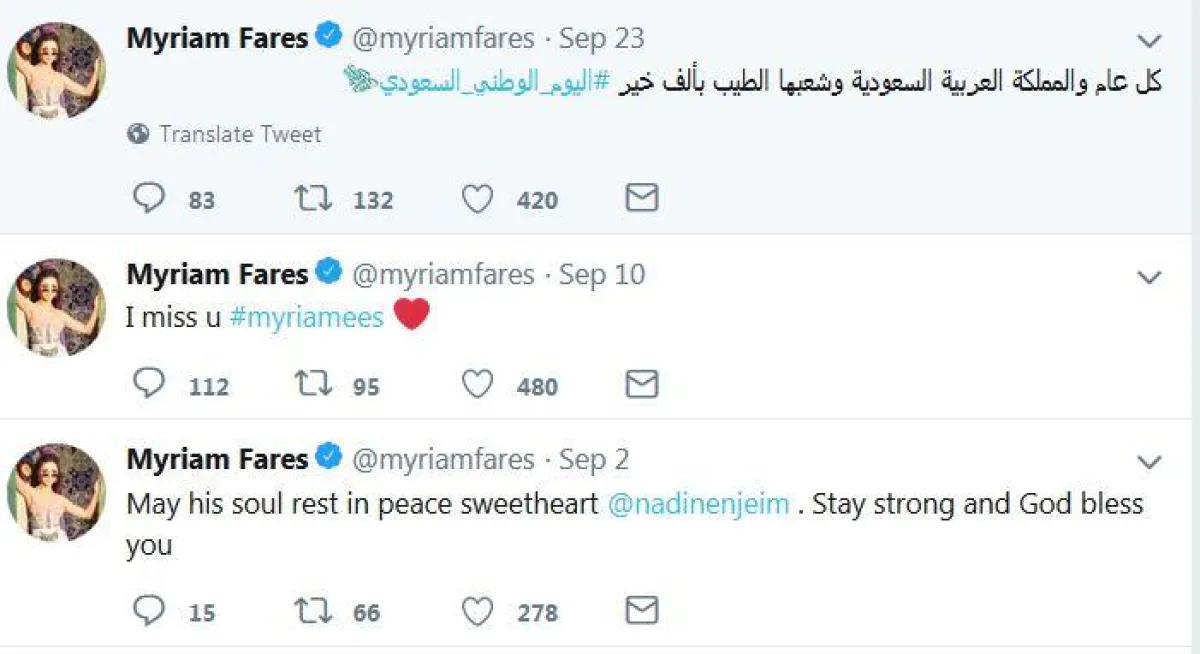 ميريام تحرص بين الحين والآخر على كتابة تغريدات كان آخرها تغريدة أعربت فيها عن اشتياقها لجمهورها، قبل أن تعود وتعايد المملكة العربية السعودية في يومها الوطني، إلا أنها لغاية اليوم لم تطمئن جمهورها إلى وضعها الصحّي.