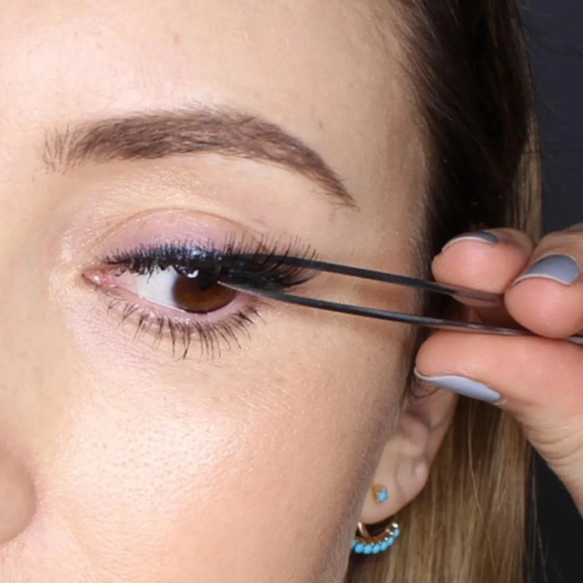 2.ابدئي بنزع الرموش برفق، انطلاقًا من الخارج نحو الداخل، ويمكنكِ استخدام ملقط صغير في حال كانت رموشكِ الاصطناعية منفصلة.