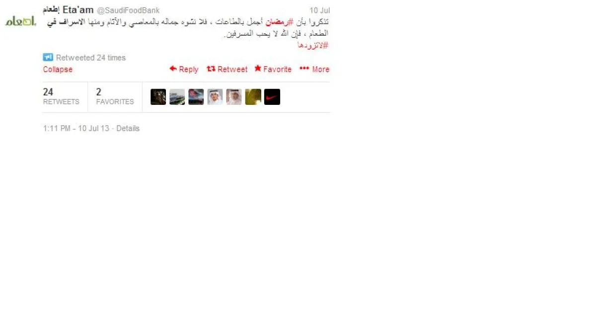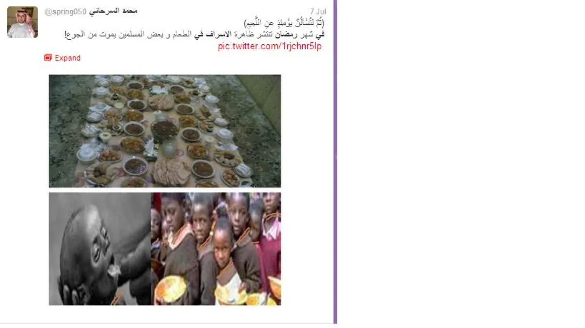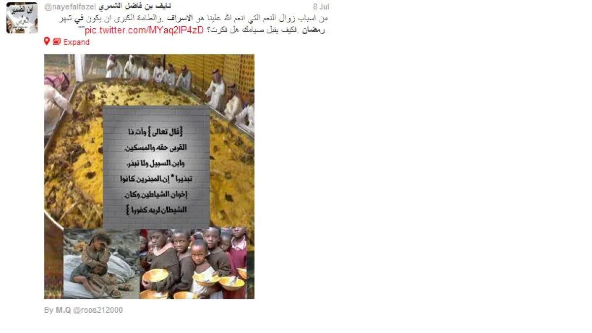 فقد كتب تعب النفيعي @ : "هناك طول سفرة في رمضان، وهناك أطول قبر جماعي في سوريا"، وغرَّد بن فاضل الشمري @عارضًا صورة لوليمة ضخمة جدًا، وأخرى لأطفال من المجاعات يتضورون جوعًا: "من أسباب زوال النِّعم التي أنعم الله علينا هو الإسراف، والطامة الكبرى أن يكون في شهر رمضان، فكيف يقبل صيامك هل فكرت؟" وكتب حمد السرحاني : "﴿ثُمّ لتُسْألُنّ يوْمئِذٍ عنِ النَّعِيمِ﴾ في شهر رمضان تنتشر ظاهرة الإسراف في الطَّعام، وبعض المسلمين يموتون من الجوع!"