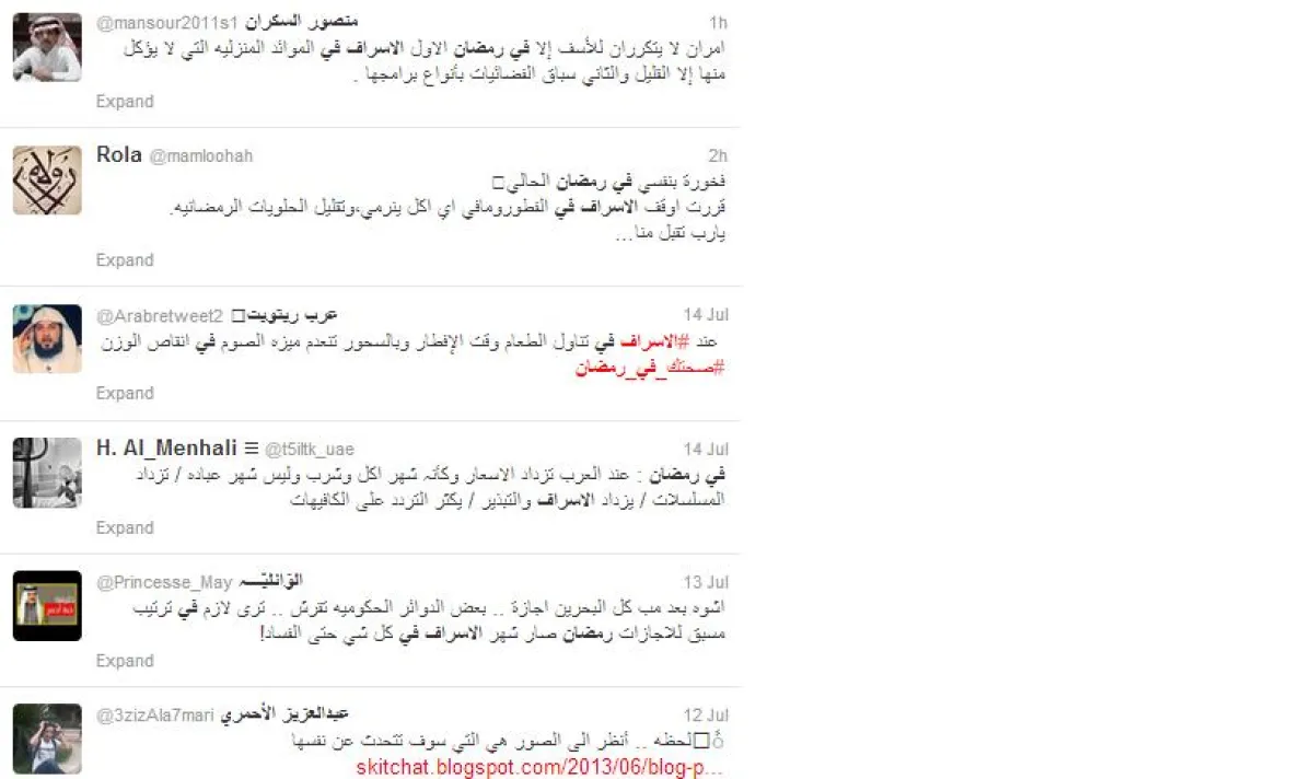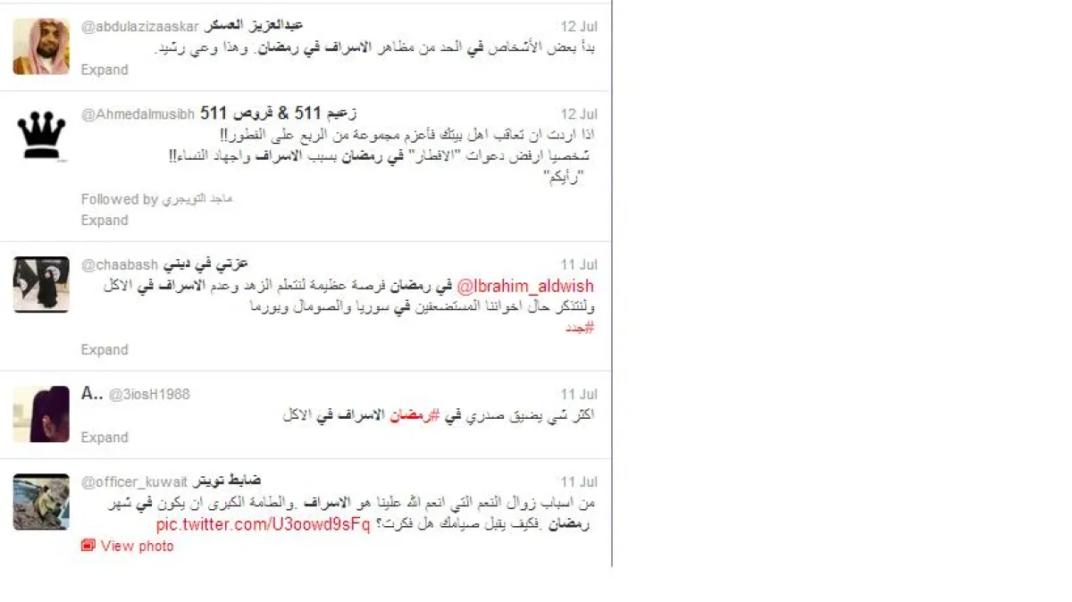 وعلى سبيل المثال غرَّد نصور السكران @: "أمران لا يتكرران للأسف إلا في رمضان: الأول الإسراف في الموائد المنزلية التي لا يؤكل منها إلا القليل، والثاني سباق الفضائيات بأنواع برامجها"، وكتب إطعامEta'am @ : "تذكروا أن رمضان أجمل بالطاعات، فلا نشوه جماله بالمعاصي والآثام ومنها الإسراف في الطعام، فإن الله لا يحب المسرفين. لاتزودها"، وغرَّد @Arabretweet2 معلقًا على الجانب الصحيّ لهذه الإسراف الغير مبرر في الطَّعام الرمضانيّ: "عند الاسراف في تناول الطعام وقت الإفطار والسحور، تنعدم ميزة الصوم في إنقاص الوزن".