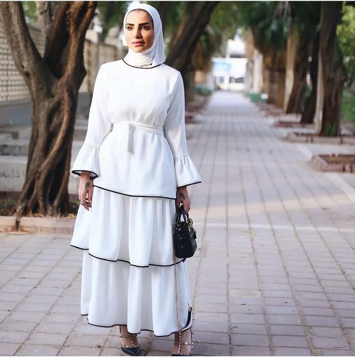بالألوان الصيفية المبهجة يمكنكِ التألق بفستان الفاشينيستا الكويتية دلال الدوب، لونها المفضل الأبيض، بـ فستان أنيق بـ كشاكش Off Shoulder، نسقت معه توب أبيض، وطرحة باللون نفسه، واختارت شنطة الكيس البلاستيكية التي ستكون رائجة لفترة طويلة مقبلة، تناسب أوقات المرح مع الصديقات، أو غذاء رومانسي مع شريكِك.