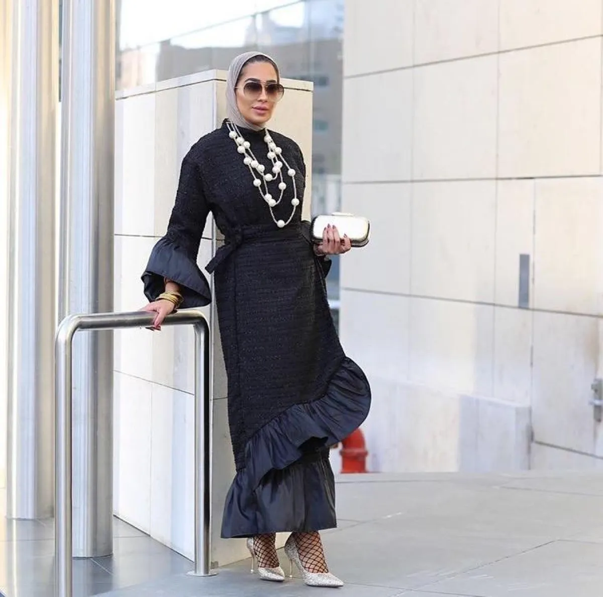 إن كنتِ من ذوات الشخصية الجريئة اللاتي يهتمِمن بالكثير من التفاصيل، إليكِ الفستان الأسود الفخم الذي ارتدته المدونة الخليجية دلال القبندي، مع جورب السمكة أو الشبكة، وكعب عالٍ ميتاليك، وكلتش باللون نفسه، يناسب حفلات النهار المختلفة، فهو بسيط ليس به تطريزات لامعة، ولكنها أضافت له لمسات كلاسيكية ليناسب رسميات النهار.