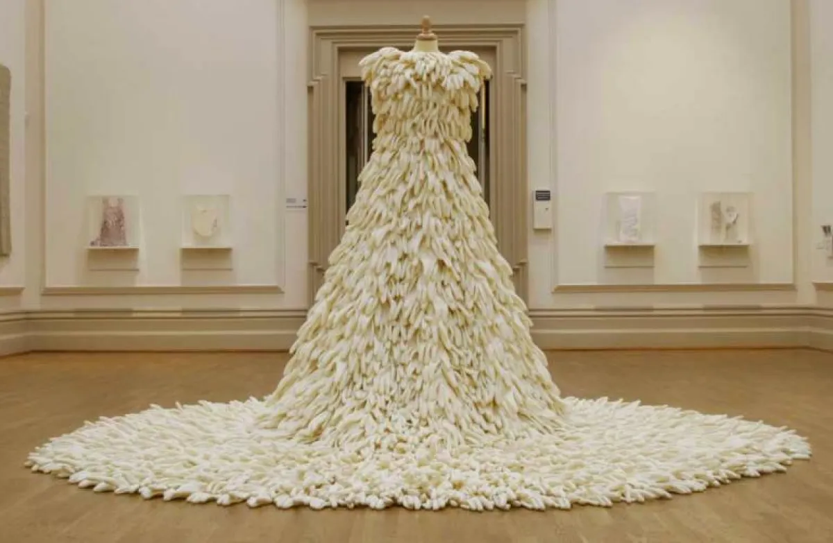 عادةً، تُستخدم القفازات المنزلية لاستعمالات عدّة، ولكن أن تُستعمل لتصميم فستان زفاف، هذا هو الابتكار بحد ذاته.