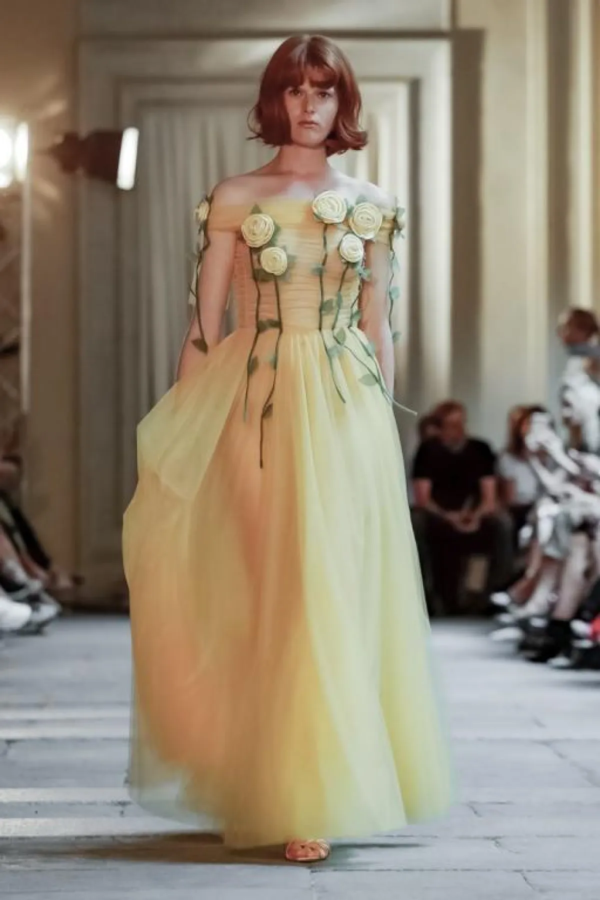 ومن الفساتين التي ستتوقفين عندها، الفستان الأصفر من Vivetta، والمصنوع من التول؛ حيث تزين بالورود الصفراء البارزة على الصدر، والذي تتدلى منه الأفرع الخضراء مع قصّة منسدلة الأكتاف.
