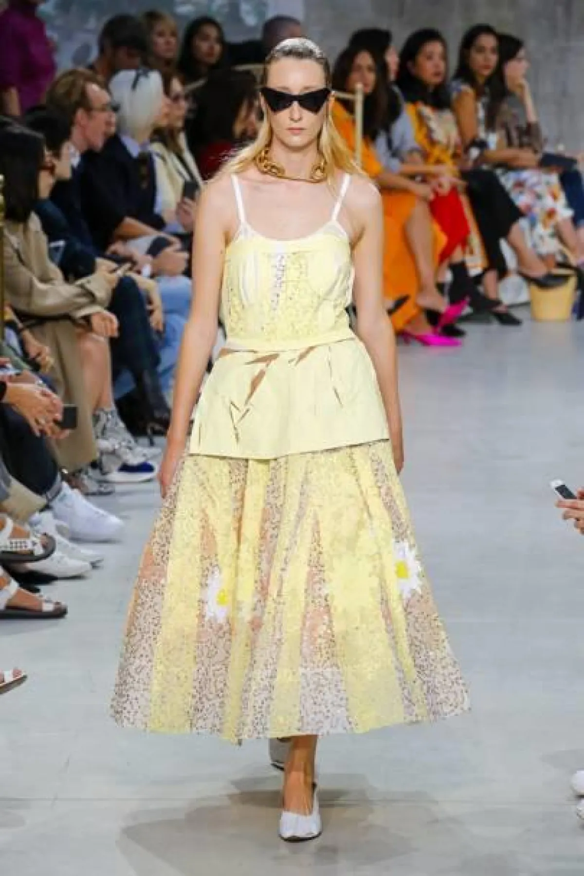 كما قدمت دار مارني Marni فستاناً أصفر بحمّالات رفيعة وتصميم غير تقليدي وتنورة شفّافة مزينة بالورود الكبيرة.