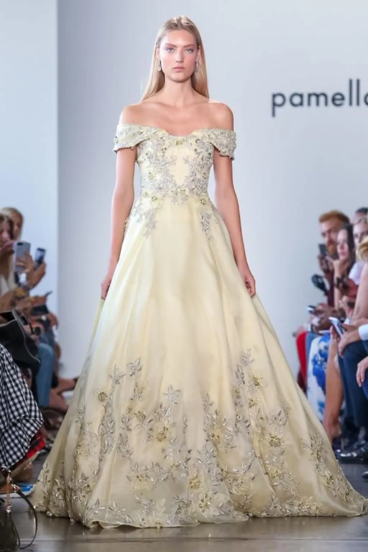 أما الفستان الثاني فاتسم بالرقي والنعومة، بفضل قصّة الـA Line مع درجة الأصفر الباسيتل وتطريزات الورود البرّاقة مع الأكتاف المنسدلة Off Shoulder.