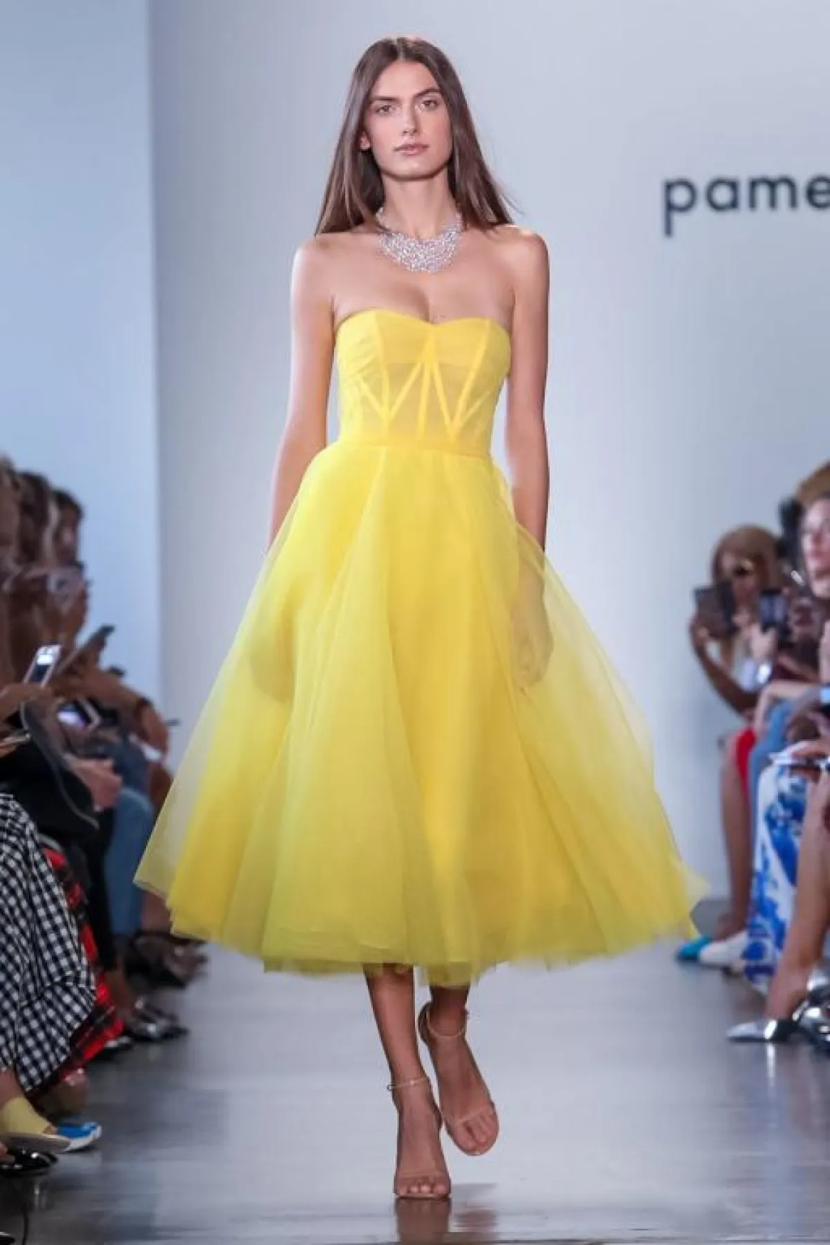 كما لفتتنا فساتين باميلا رولان Pamella Roland بـ اللون الأصفر، الفستان الأول بتصميم متوسط الطول Midi يبدو عصرياً بقصته المنفوشة بـ التول.