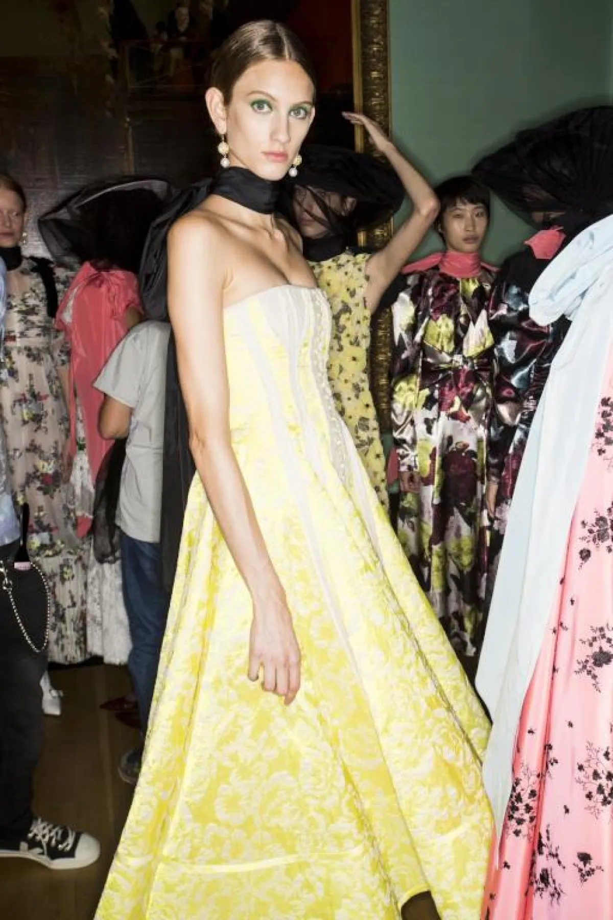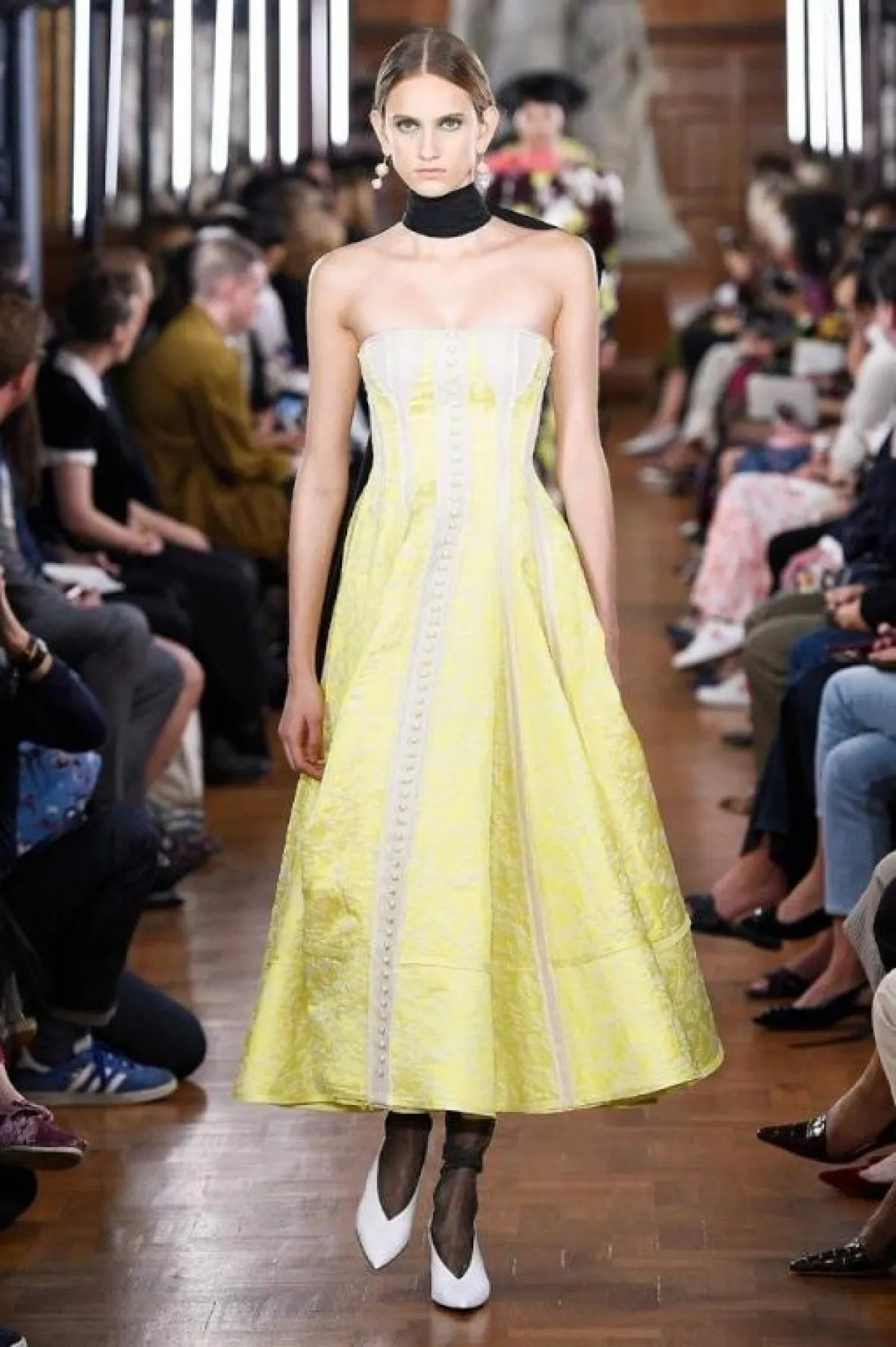 وأدخلت دار إيرديم Erdem اللون الأسود أيضاً مع الفستان الأصفر المنفوش والمتوسط الطول Midi ومزين بطبعات الورود البيضاء، فاعتمدت العارضة طوق رقبة باللون الأسود مع الفستان.