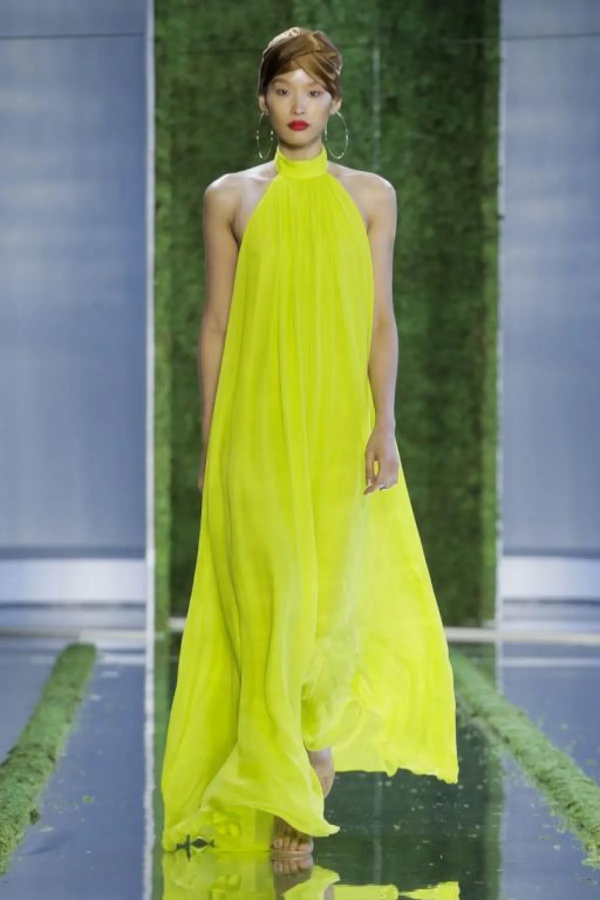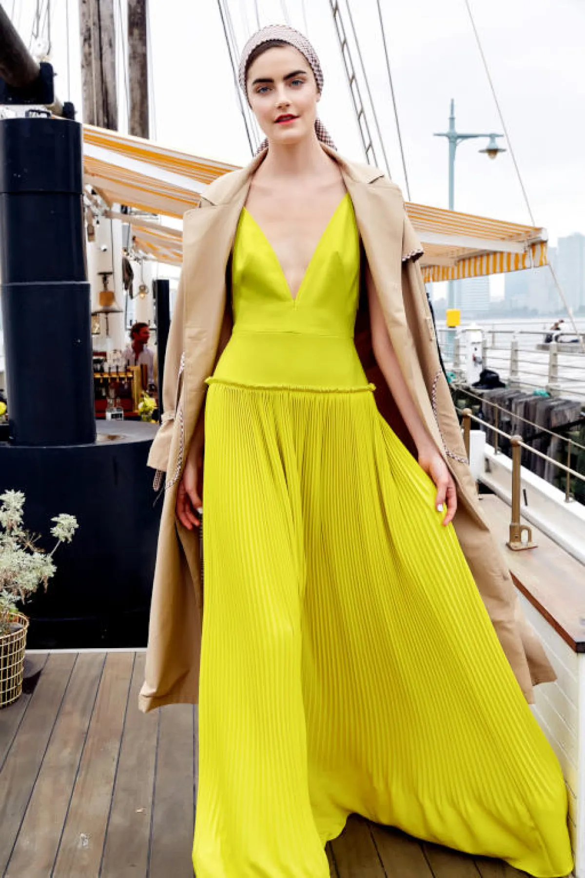فقدمت ماركة Emilia Wickstead فستاناً أصفر غير تقليدي؛ حيث تزين بفيونكة حول الصدر تنسدل منها أشرطة طويلة تجمع بين الأصفر والأسود.