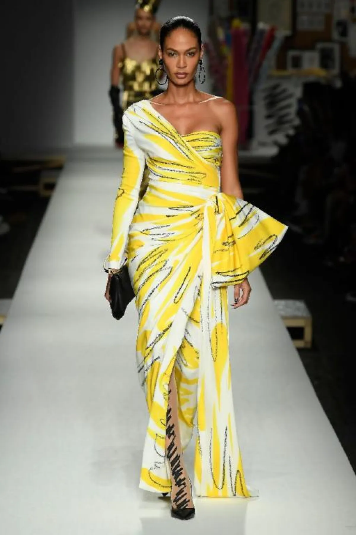 أما دار موسكينو Moschino، فمزجت بين اللونين في خطوط متداخلة، بالإضافة إلى اللون الأبيض، وفستان بكم واحد مع رابطة جانبية على الخصر وقصّة ضيقة تبرز انحناءات الجسم.