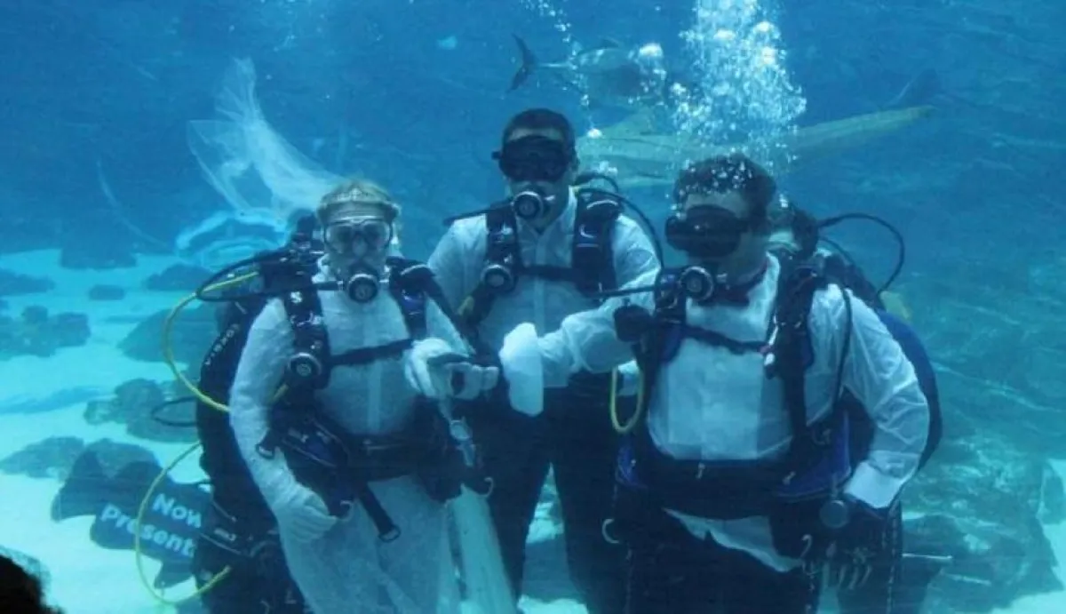 وأقام العريس قاعة زفاف بسيطة وسط الشعاب المرجانية، مرتدياً وعروسه والمأذون أسطوانات الأكسجين الخاصة بالتنفس، وذلك في تقليد ليس جديدًا على المنطقة التي جرت بها من قبل حالة زفاف مماثلة.